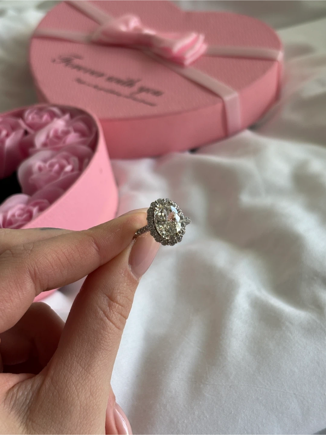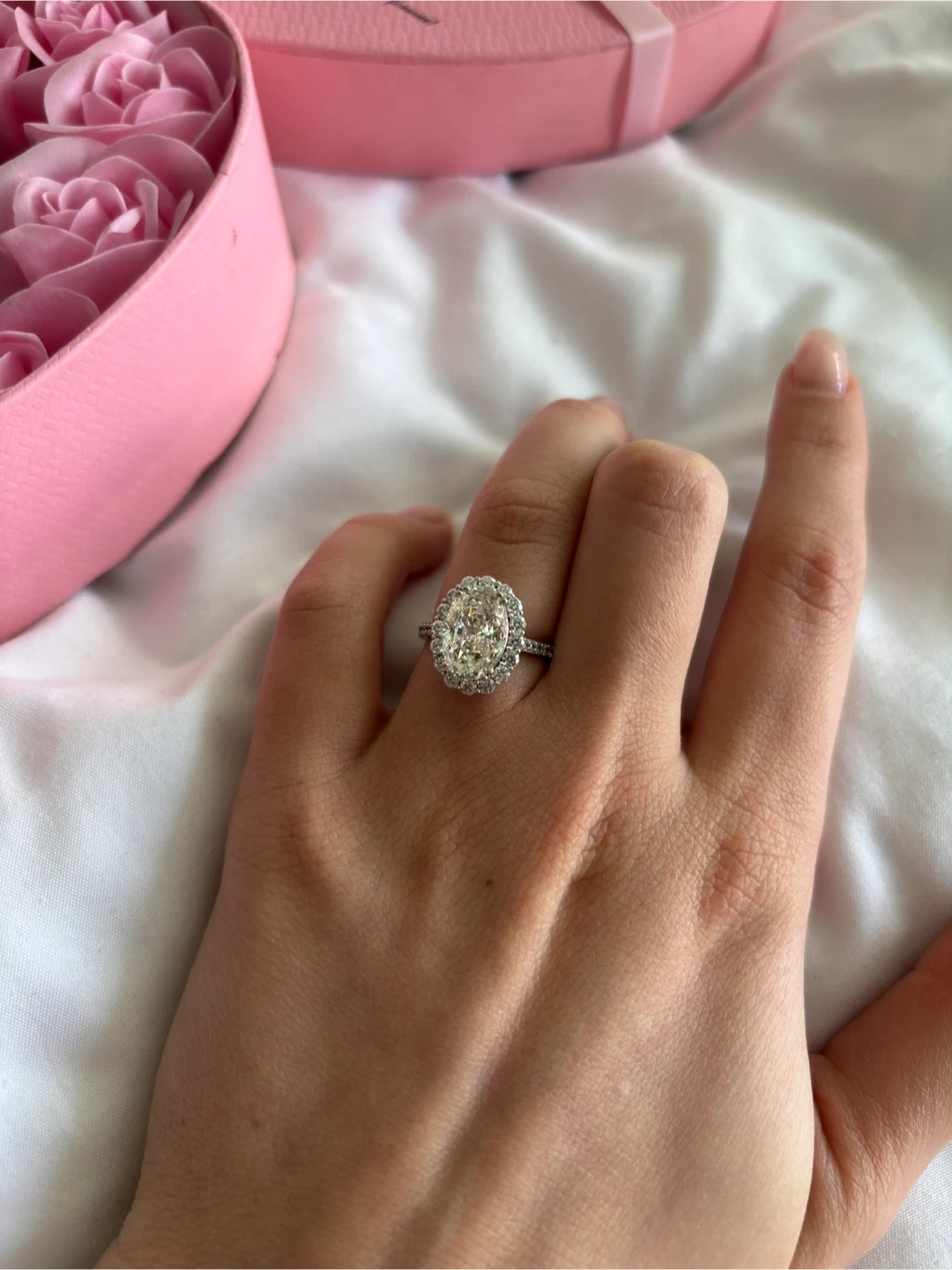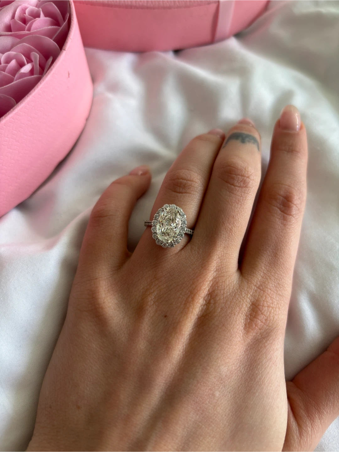 45Selling a beautiful engagement ring! It features an oval-cut stone surrounded by a halo of smaller stones. The band is a delicate metal, silver 925 and moissanite.It's in great condition and ready to be worn! Size 6-7