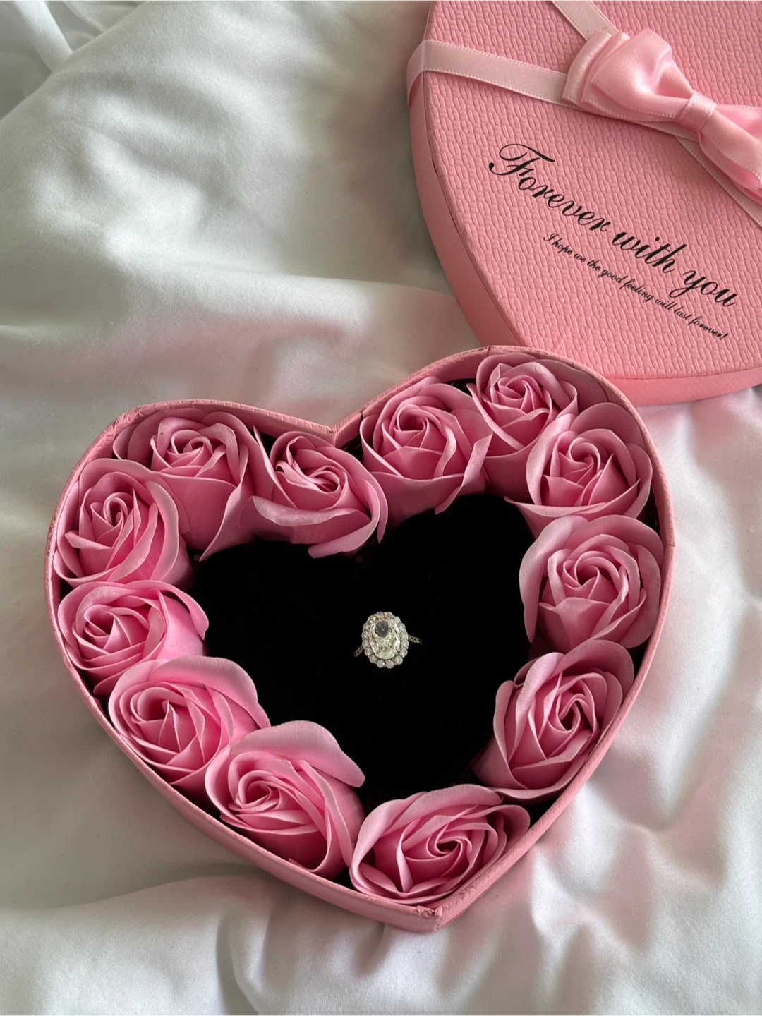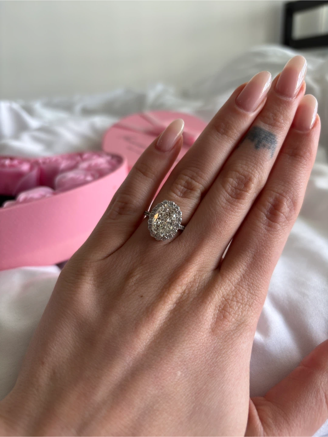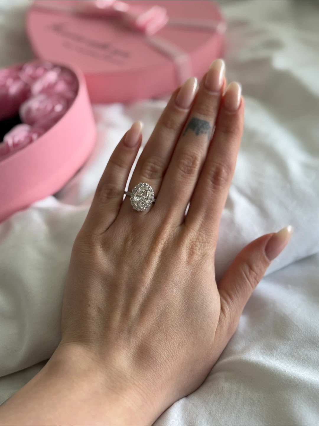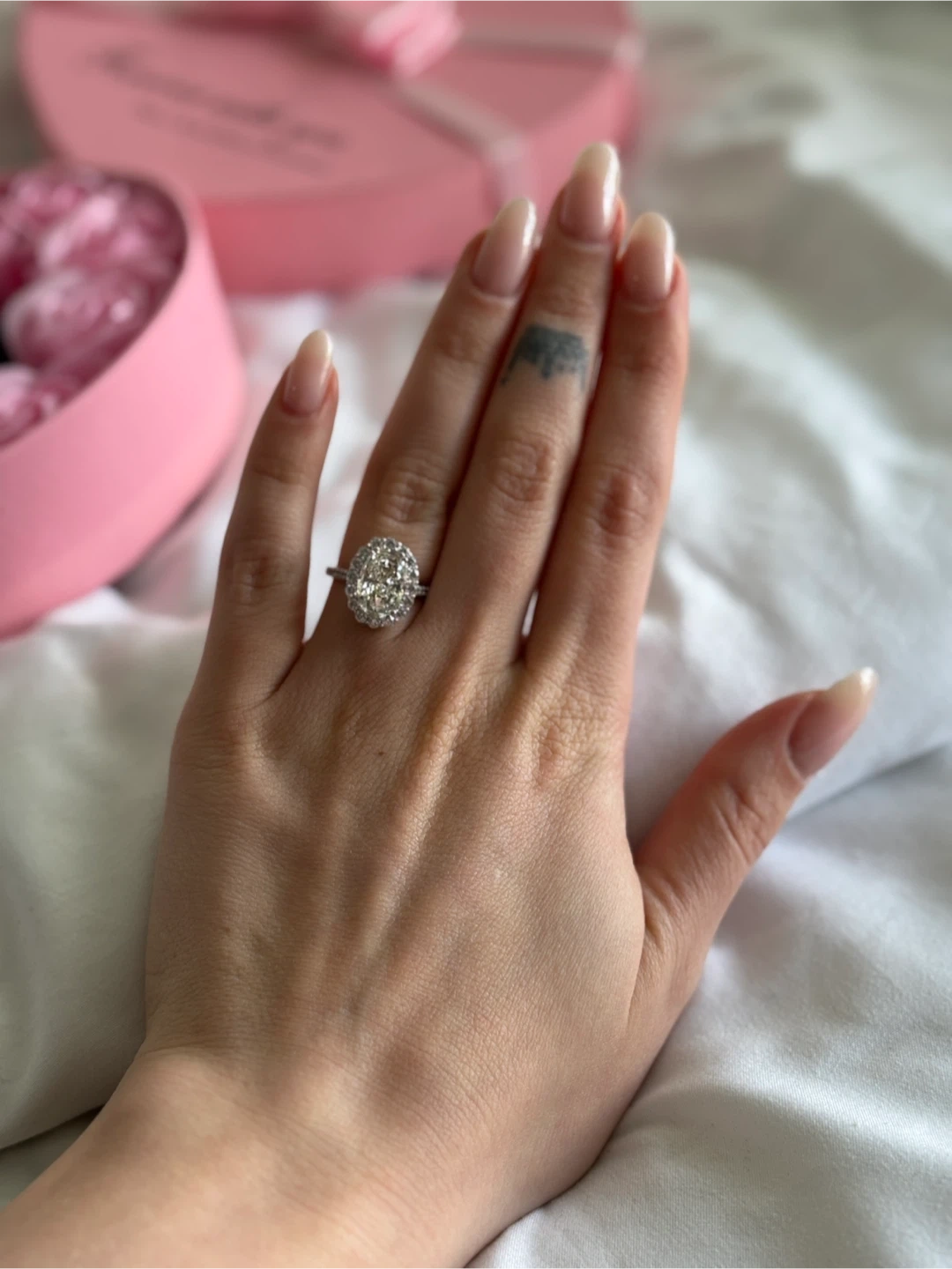 45Selling a beautiful engagement ring! It features an oval-cut stone surrounded by a halo of smaller stones. The band is a delicate metal, silver 925 and moissanite.It's in great condition and ready to be worn! Size 6-7