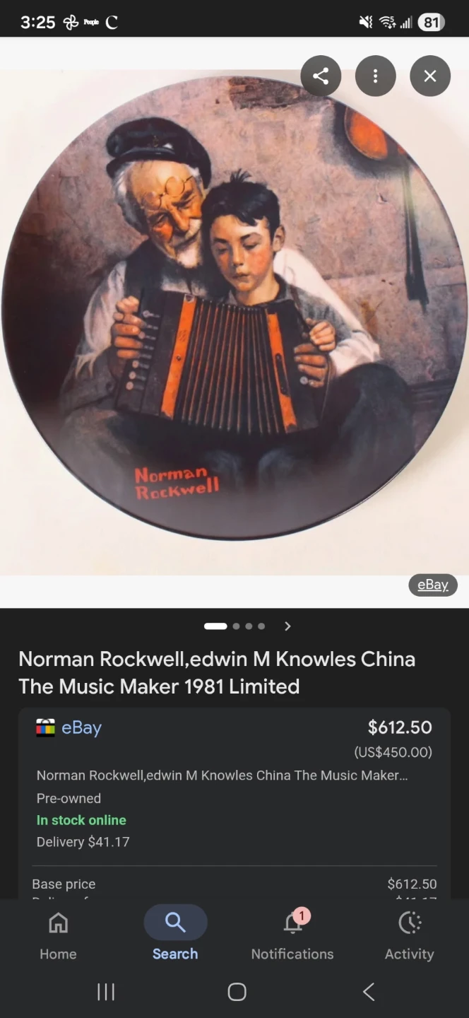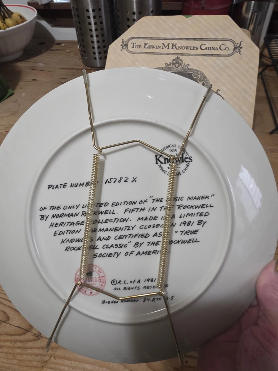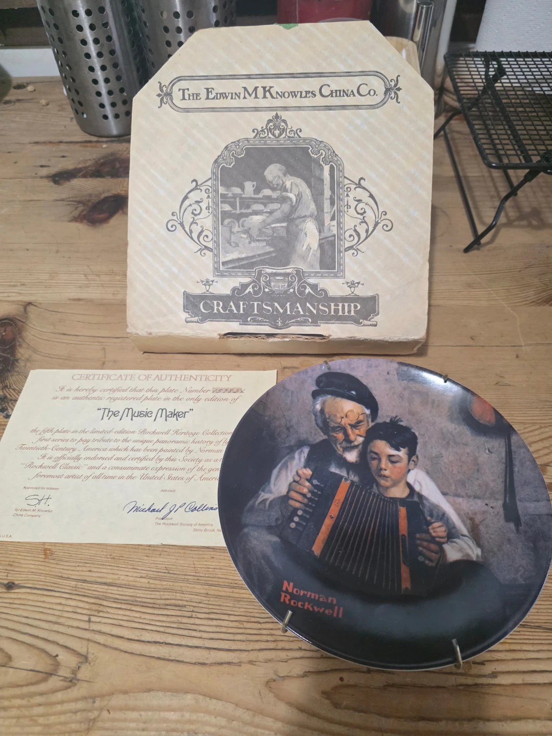 This is a limited edition collector plate titled "The Music Maker" by Norman Rockwell, produced by The Edwin M. Knowles China Company in 1981. It's part of the Fifth in a Limited Heritage Collection. Includes original box and certificate of authenticity. Plate number 15782X.