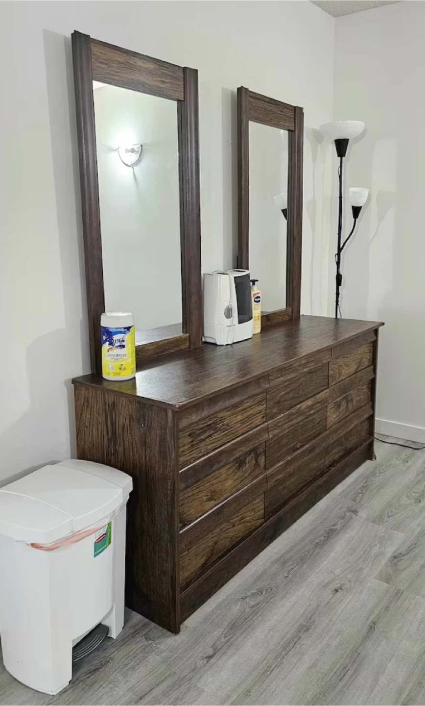 This is a dark wood dresser with two attached mirrors. It features a six-drawer design for ample storage. The wood finish has a distinctive horizontal plank pattern on the drawer fronts.