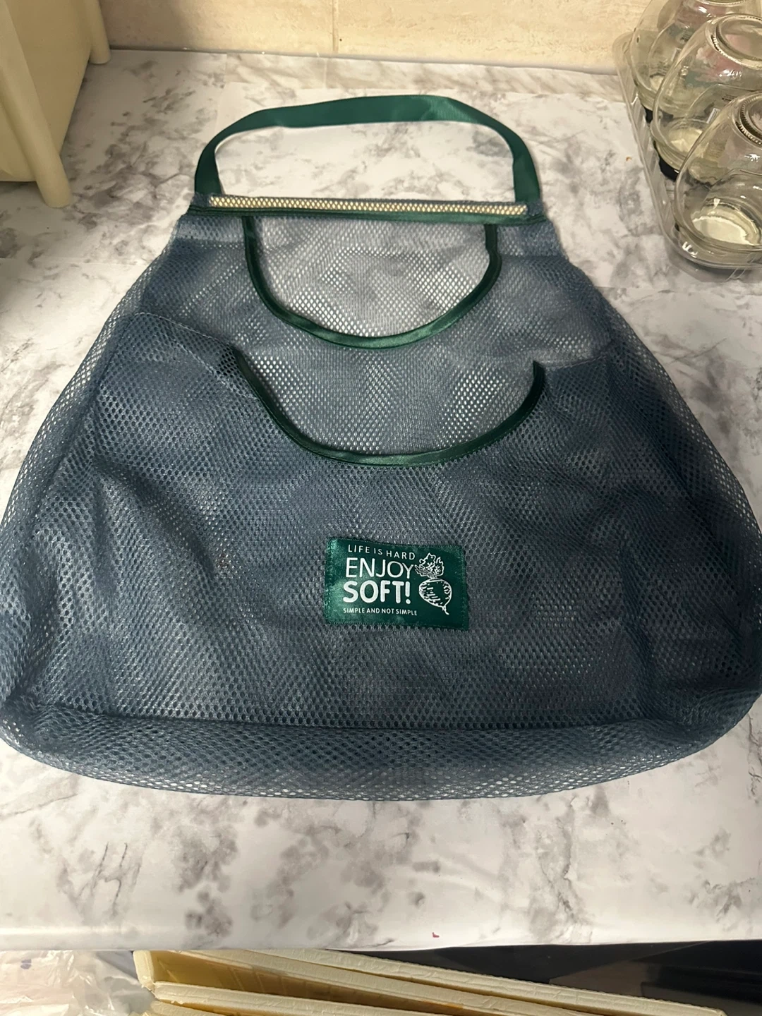 161This is a grey reusable produce bag from Enjoy Soft. It's perfect for carrying fruits and vegetables from the market. It's in great condition and ready for a new home!