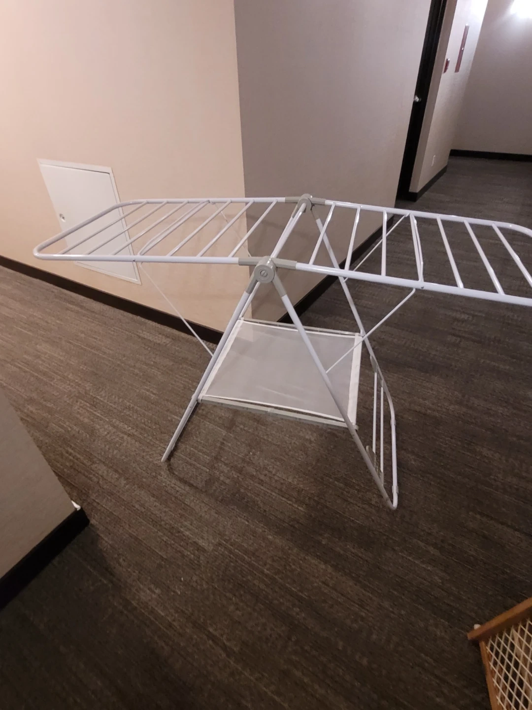 This white foldable clothes drying rack is perfect for air-drying laundry. It's lightweight and easy to store when not in use. This rack offers ample space for hanging clothes, towels, and more.