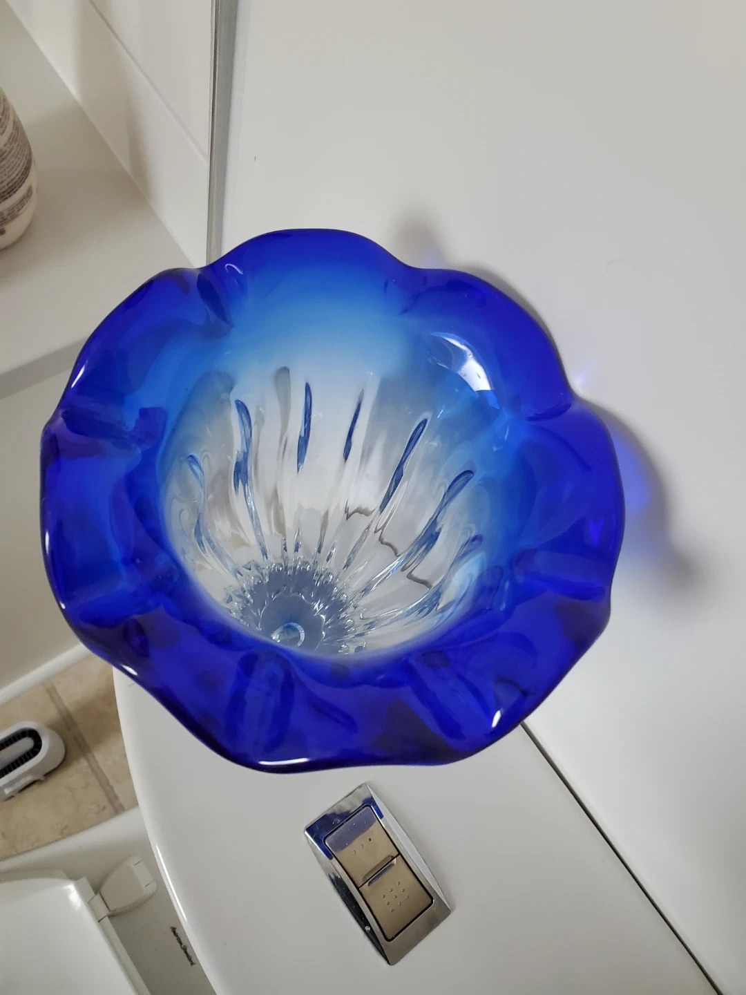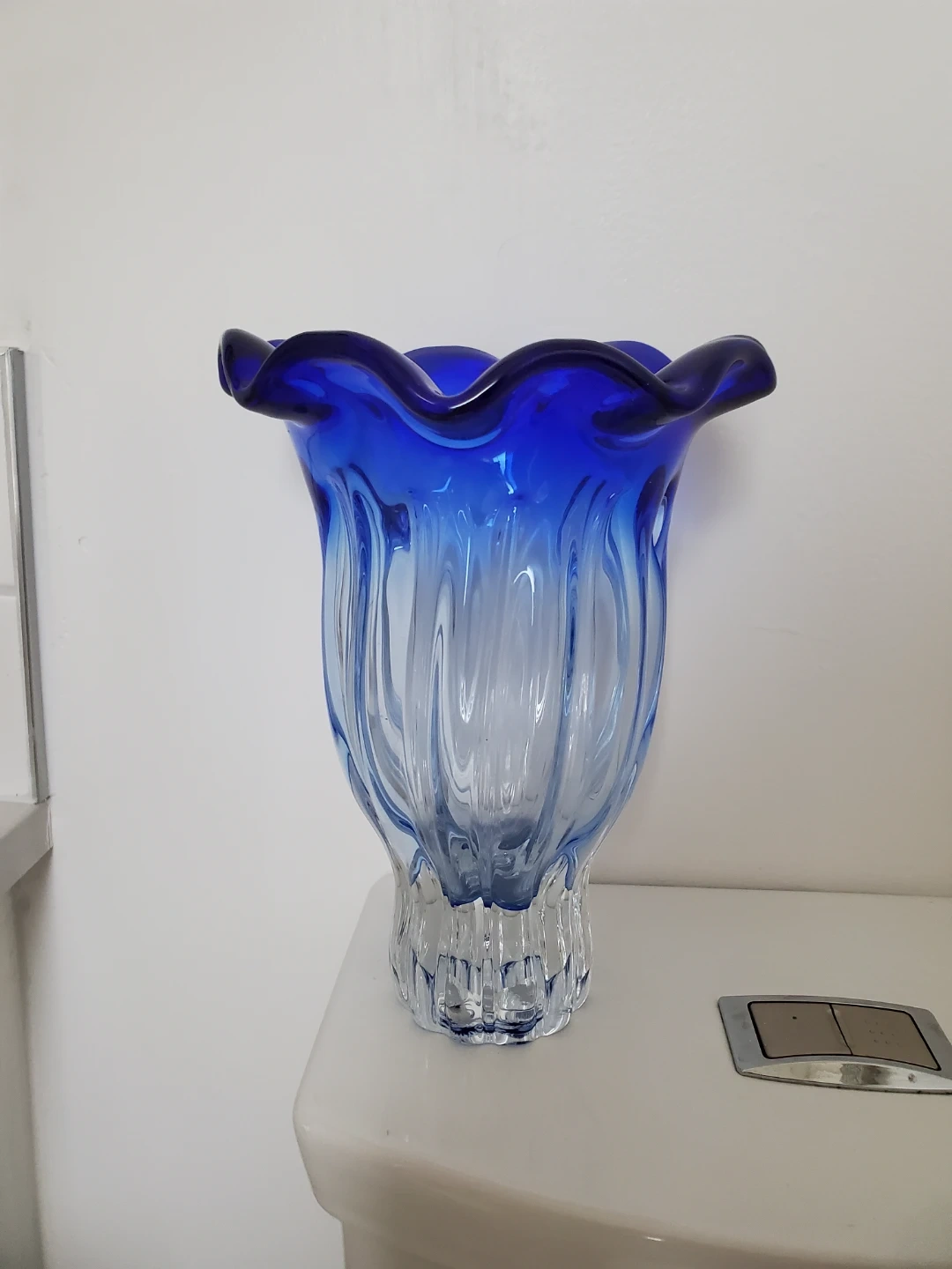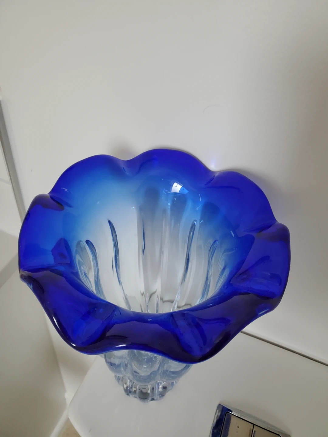 Beautiful glass vase with a vibrant blue ombre effect. Its fluted rim adds a touch of elegance. This vase is perfect for displaying fresh flowers or as a standalone decorative piece.