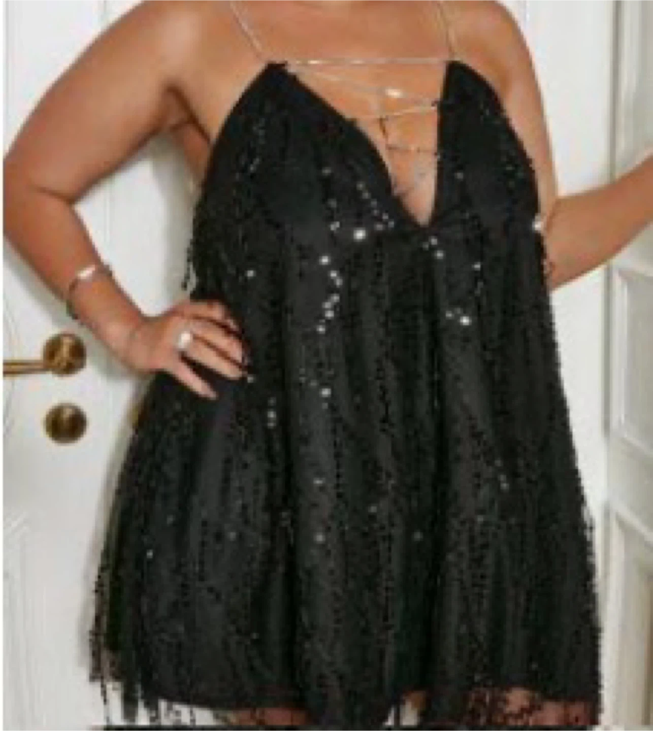 Black mini dress with all-over sequin embellishment. It features a plunging neckline with delicate chain detailing. Dress length hits above the knee.