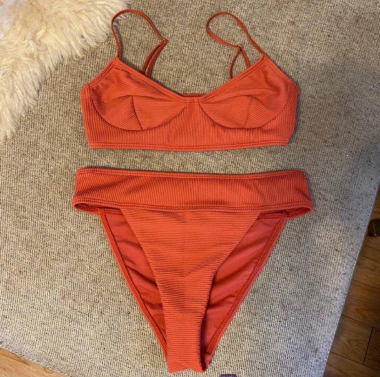 Bottoms are US 4 and the top is a U.S. 6. I only tried on the top and it absolutely does not fit, and I’m a 34B so it would be better for someone a little smaller. Has no underwire so it’s super comfortable. The bottoms did have the safety strip removed however I haven’t worn them.