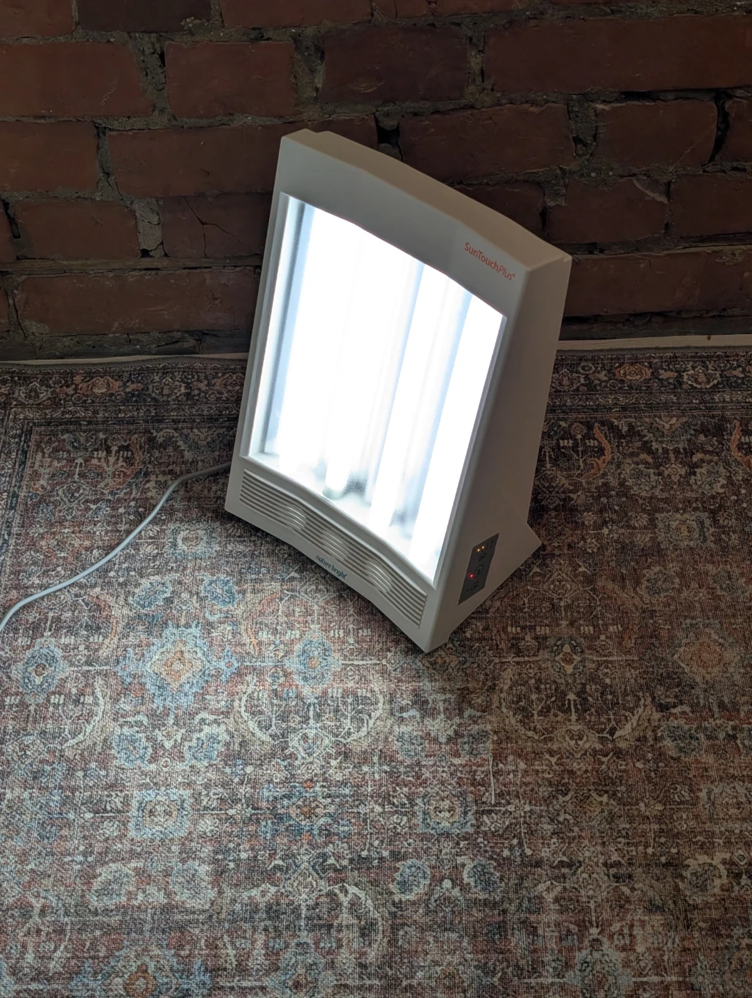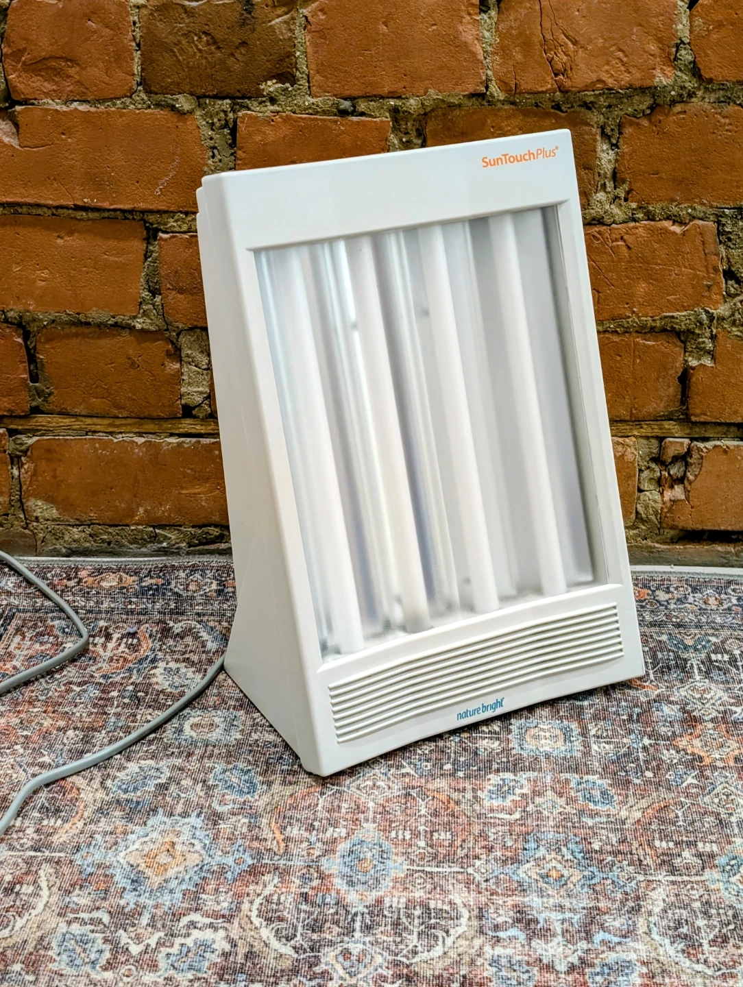 This is a Nature Bright SunTouch Plus lamp. It has a timer with settings for 15, 30, 45, and 60 minutes. The unit also features an on/off switch and an ion function. It's designed for home or office use.