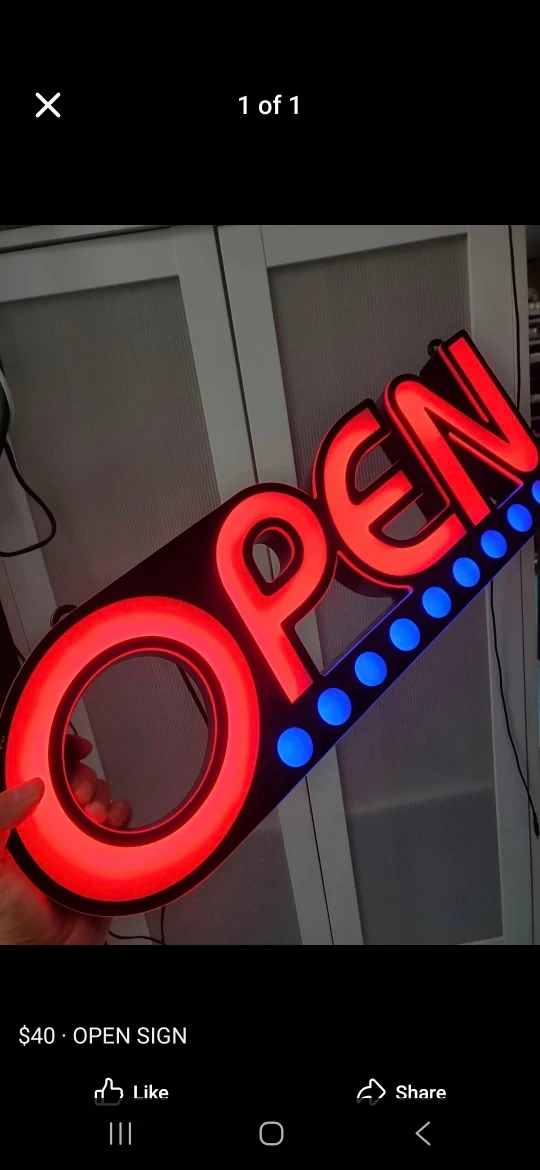 This is a bright red and blue open sign. It's perfect for any business looking to attract customers! It has a black backing and comes with a power cord. Works great