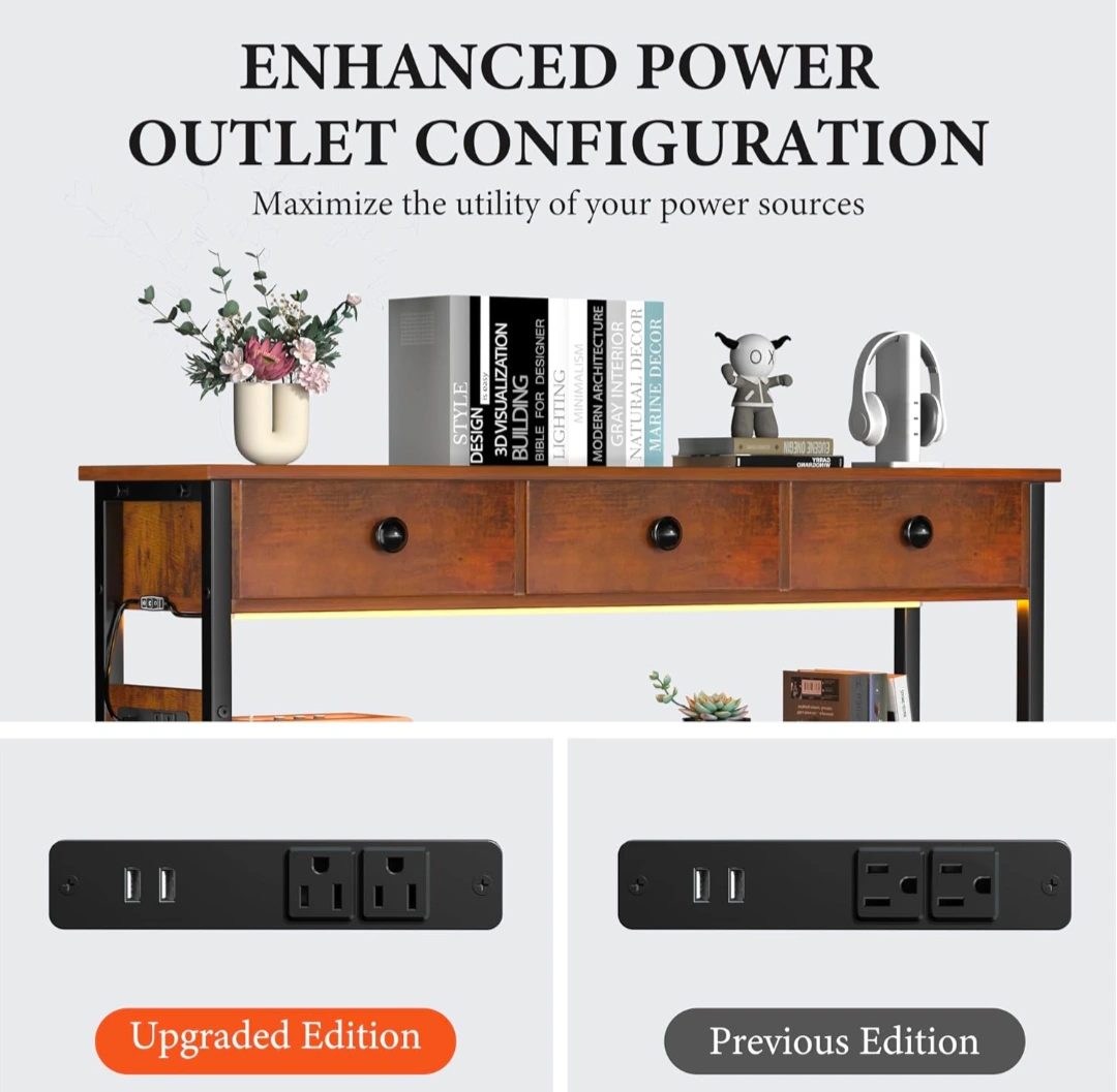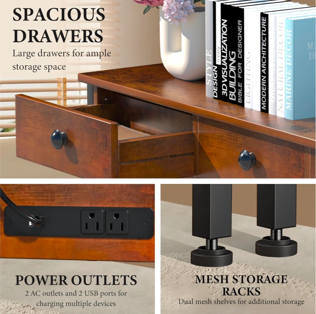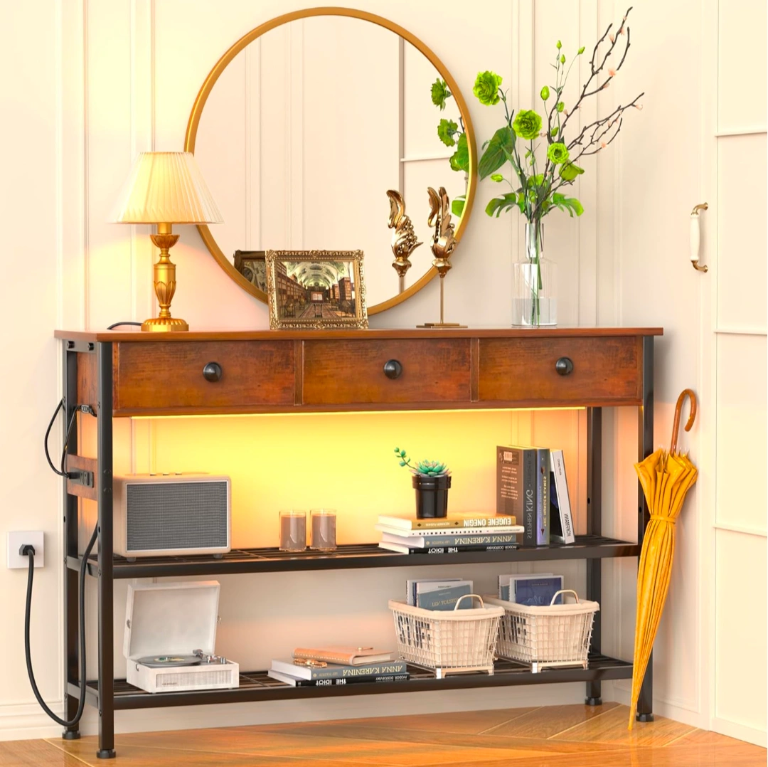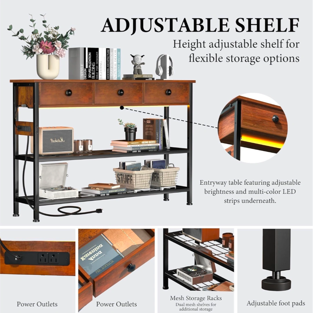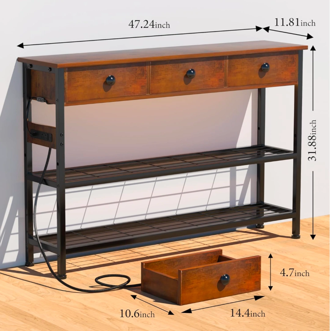 Looking to add some rustic charm and functionality to your entryway or living space? This entryway table is perfect! It features three drawers for storage and two mesh shelves below for additional space for books, baskets, or decor. It also has a built-in power outlet and USB ports, making it super convenient for charging devices. The height-adjustable shelf and adjustable foot pads add to its versatility. The dimensions are approximately 47.24 inches wide, 11.81 inches deep, and 31.88 inches high