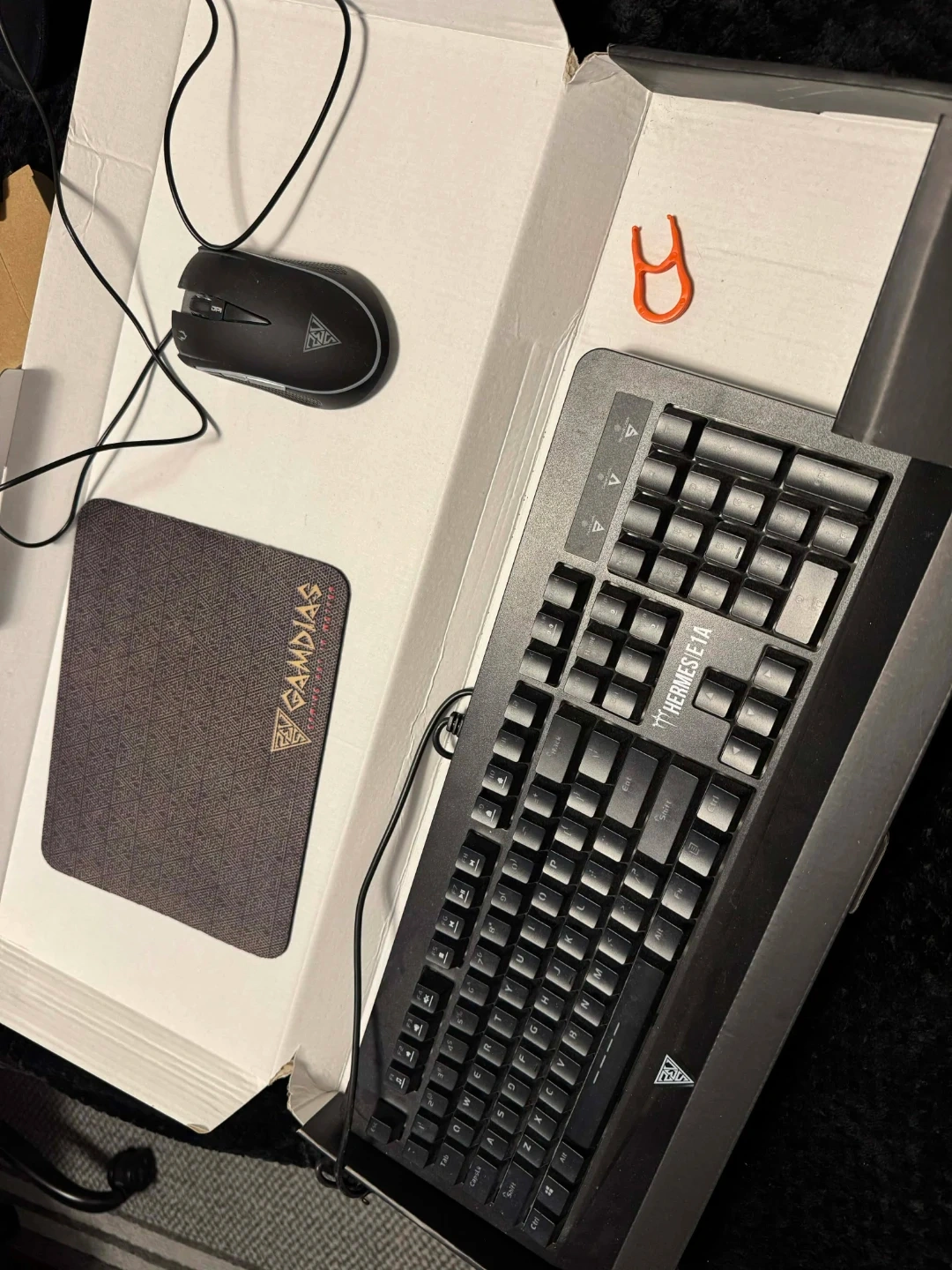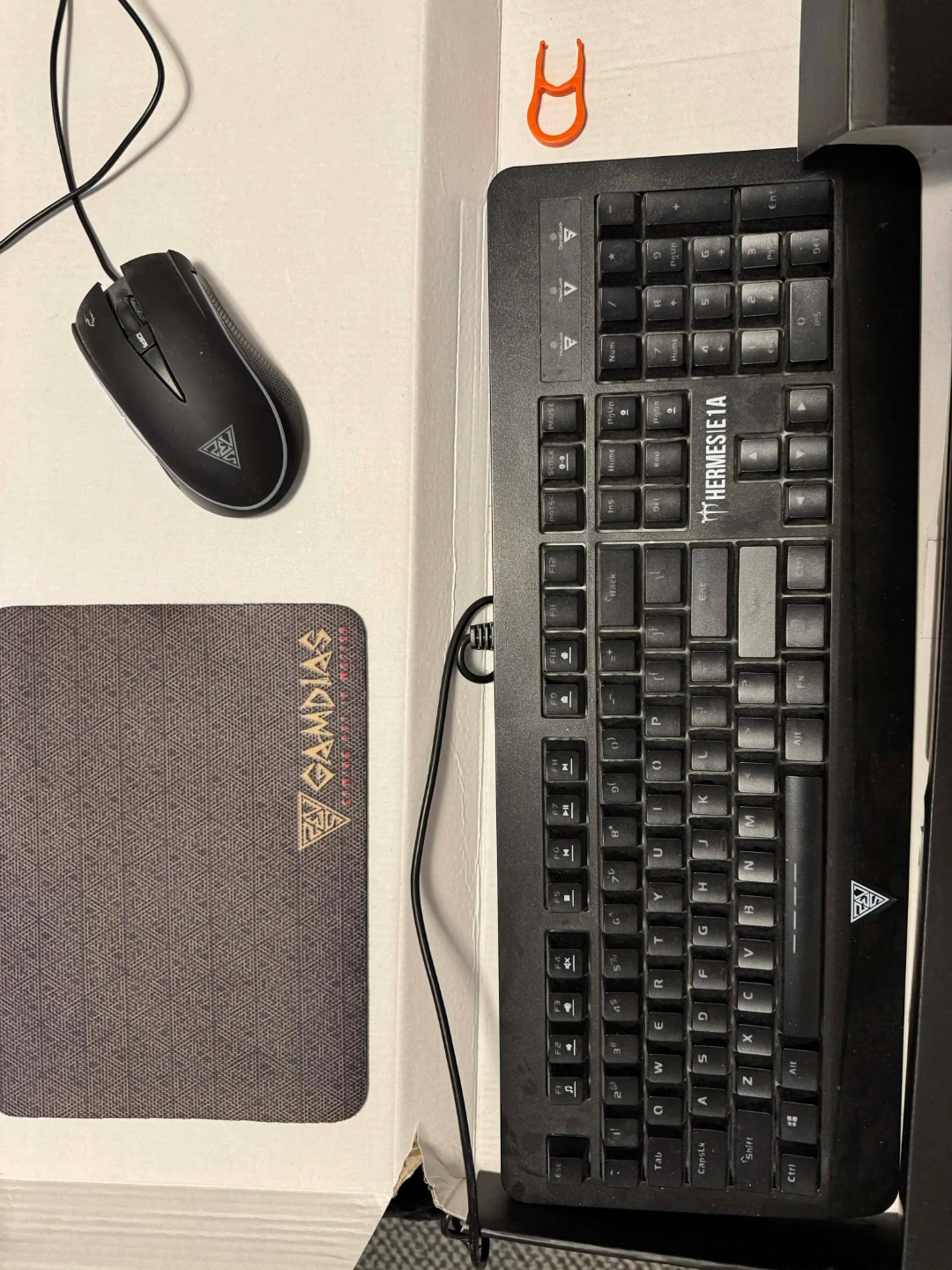 This is a Gamdias Hermes E1 3-in-1 gaming combo. It includes a keyboard, a gaming mouse, and a mousepad. The keyboard features multi-color lighting. This set is great for PC gamers looking for an affordable upgrade.