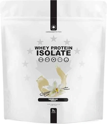 This is Canadian Protein's Vanilla Whey Protein Isolate. It comes in a 2kg bag. This product is suitable for anyone looking to supplement their protein intake.