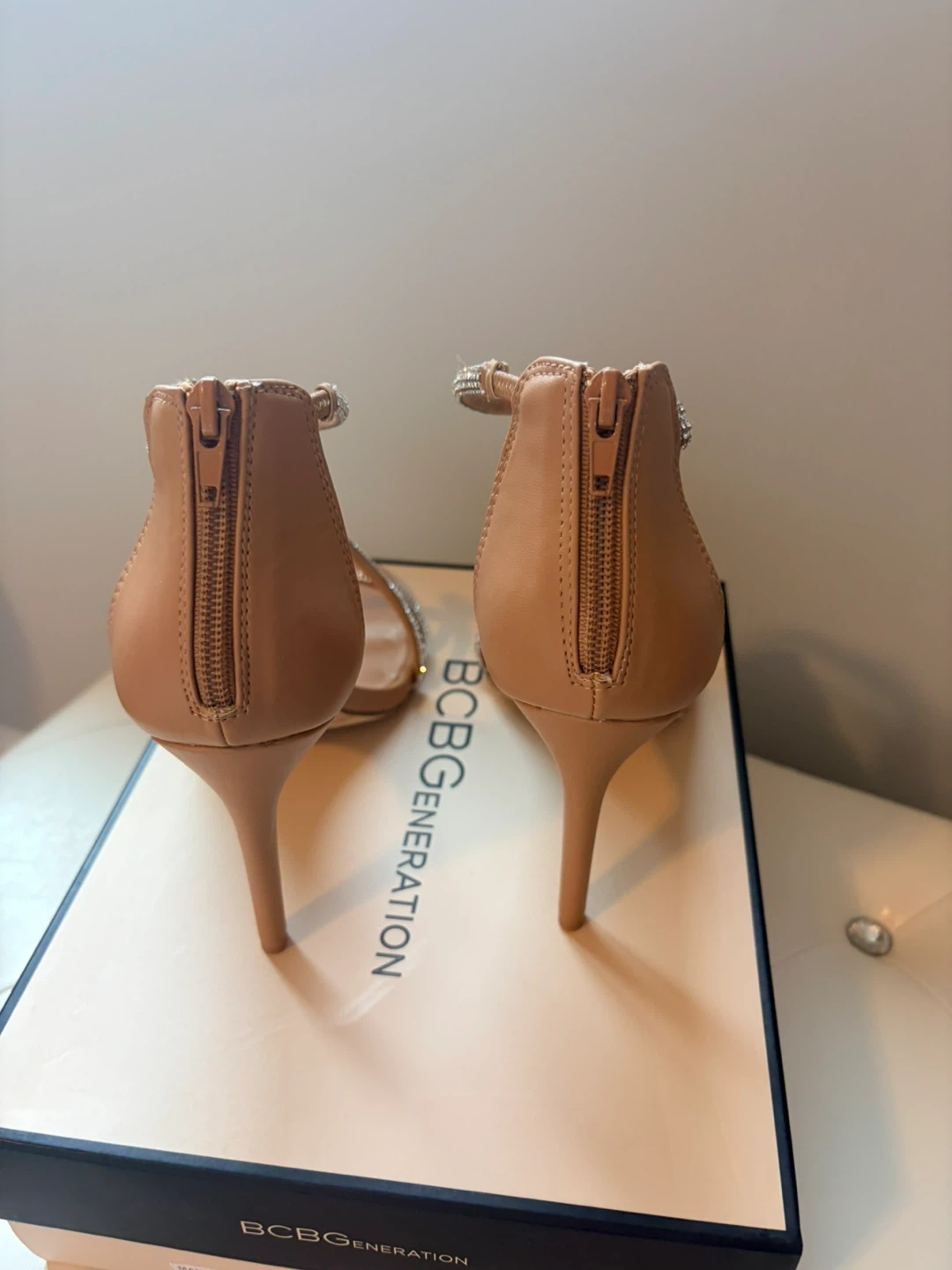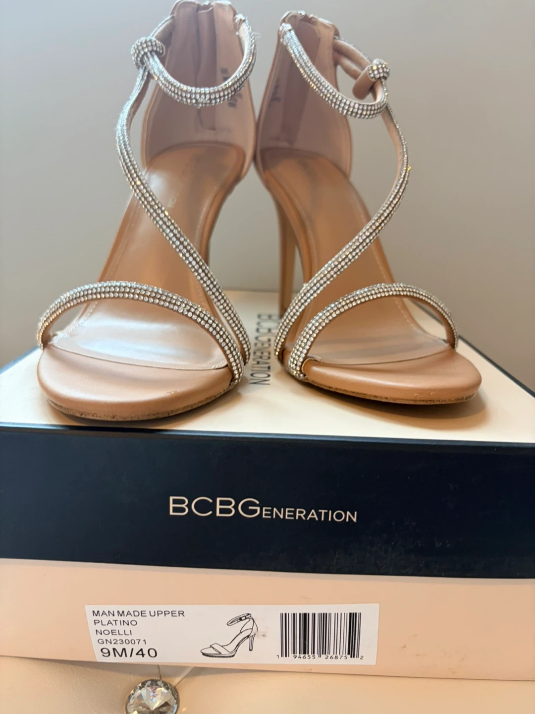 These BCBGeneration heels feature a delicate strappy design with sparkling rhinestones. They have a secure zip closure at the back. Heel height appears to be approximately 3-4 inches.