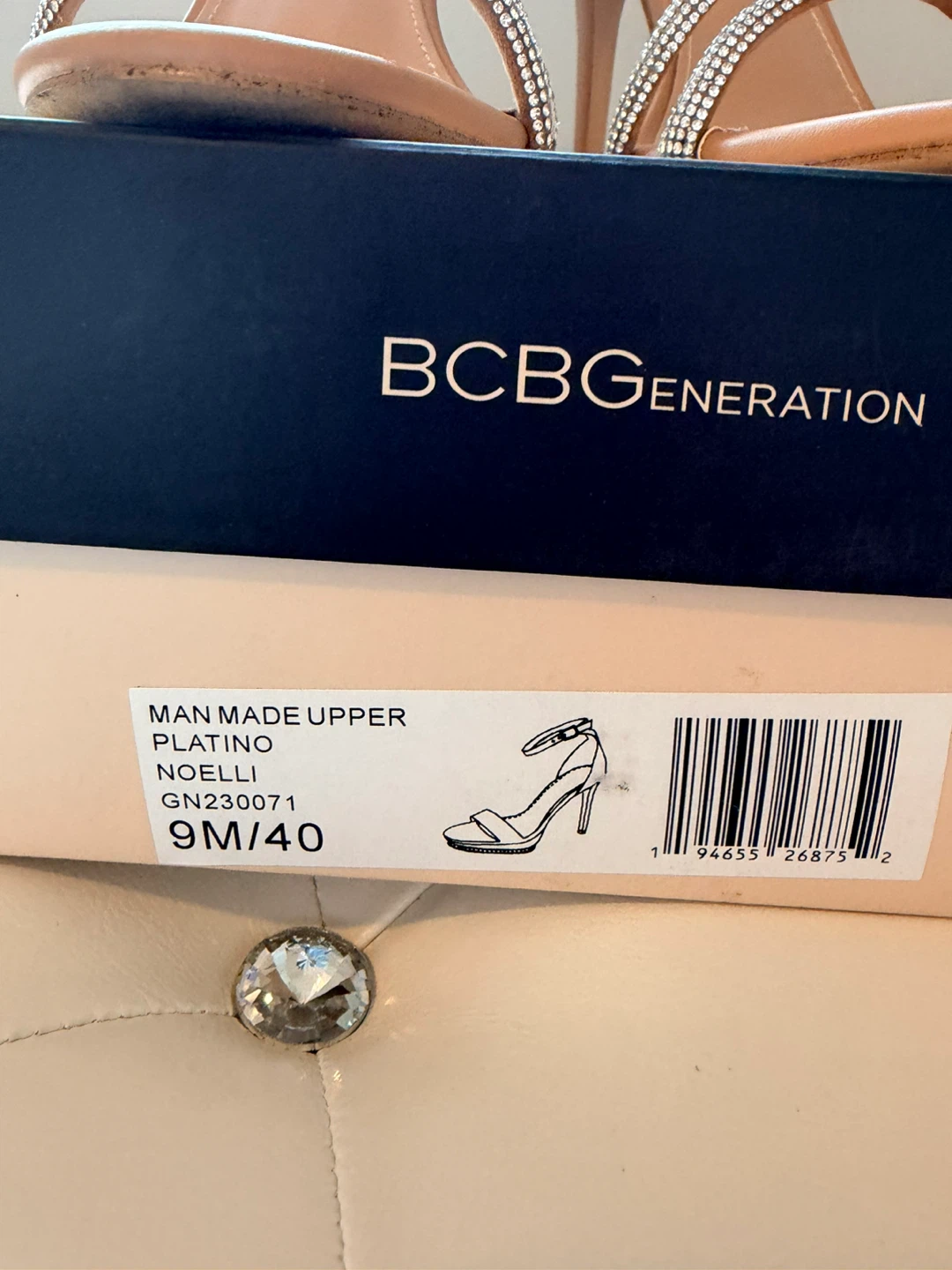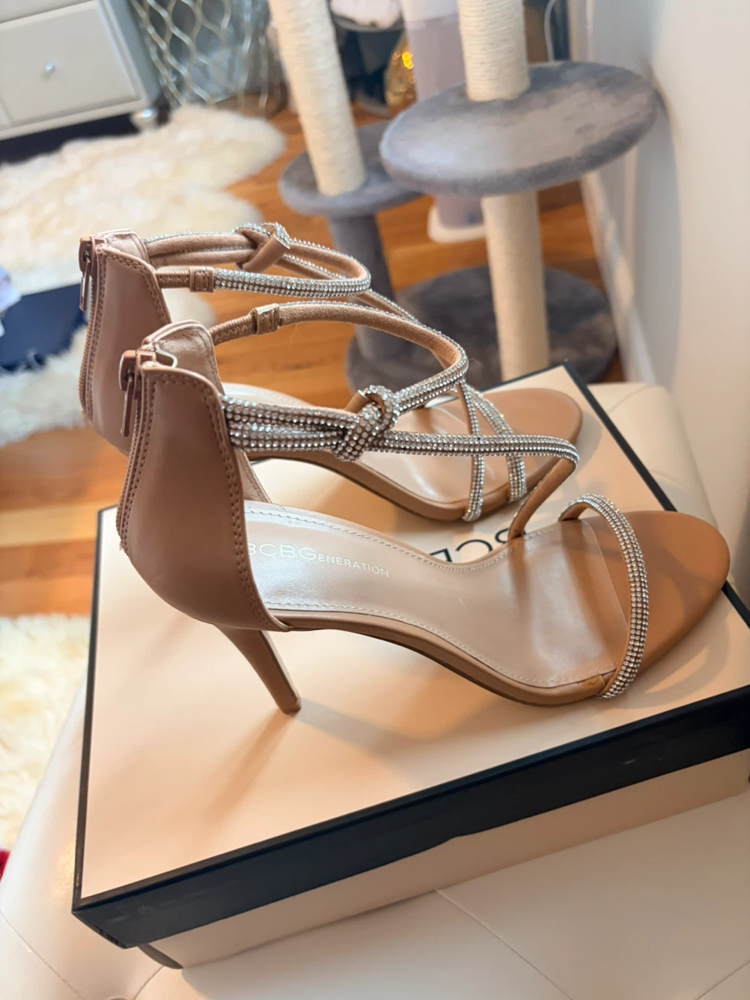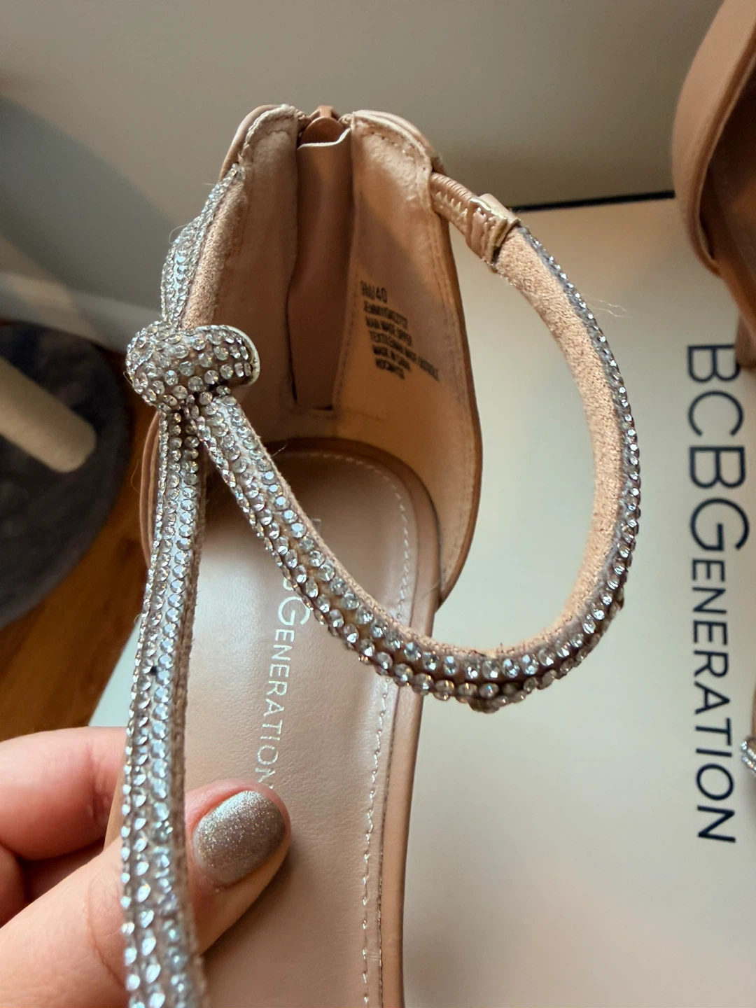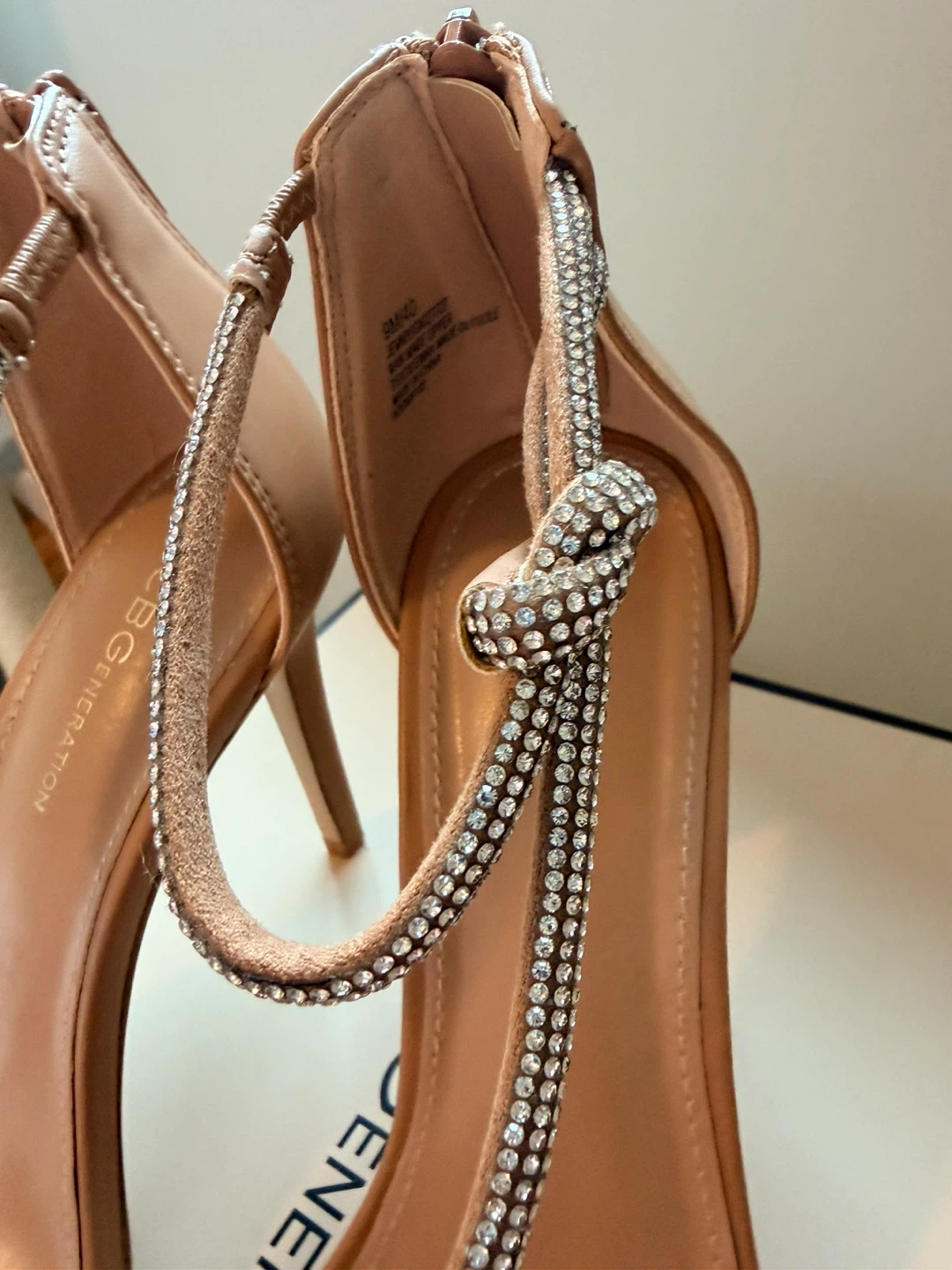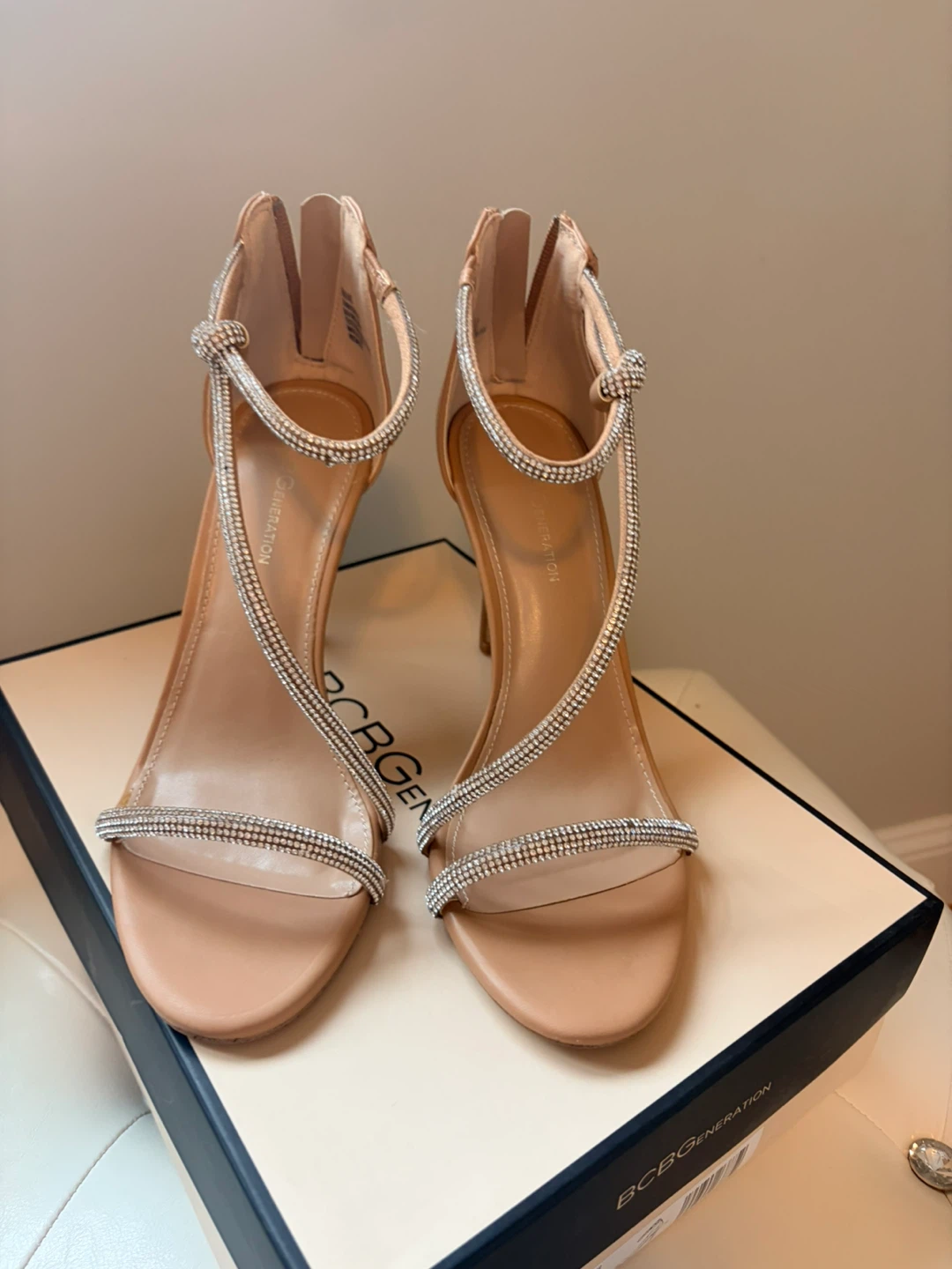 These BCBGeneration heels feature a delicate strappy design with sparkling rhinestones. They have a secure zip closure at the back. Heel height appears to be approximately 3-4 inches.