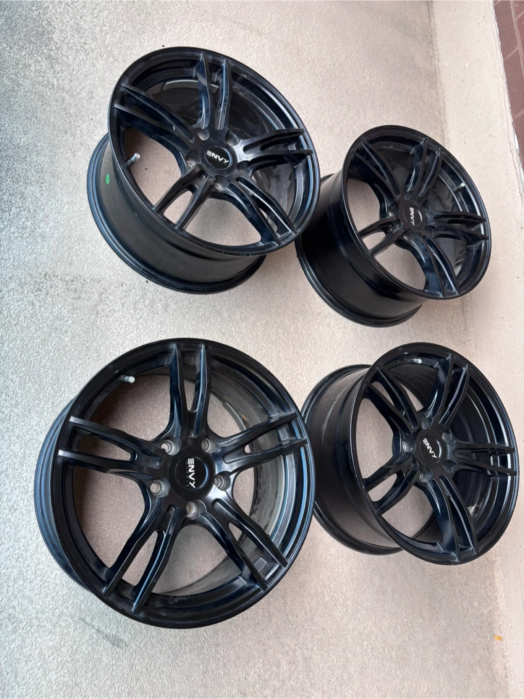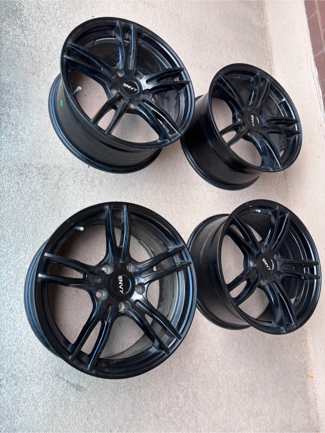 Selling a set of four Envy rims in black. They're in good condition and ready to be put on your vehicle! bolt pattern 5x120, 17 inch Envy Ev 5 rims in excellent condition. fits most honda, Accura, lexus, BMW. not a single curb rash. just selling because, switched to different car.