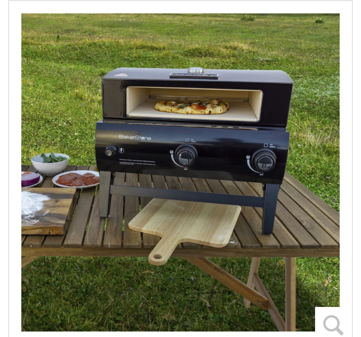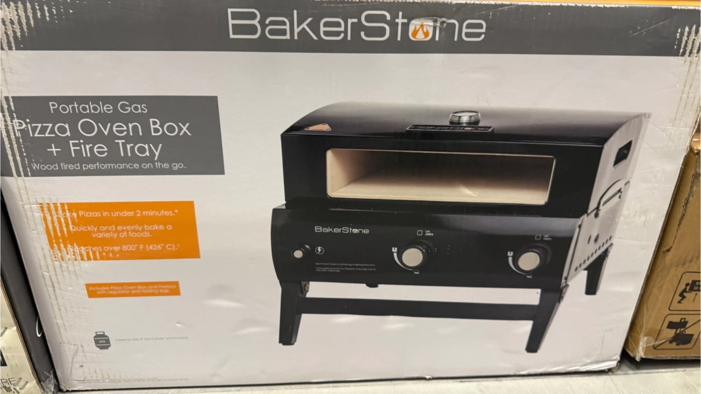 This is the BakerStone Portable Gas Pizza Oven Box with a fire tray. It's designed for wood-fired performance on the go. It reaches over 600°F (426°C) and cooks pizzas quickly!