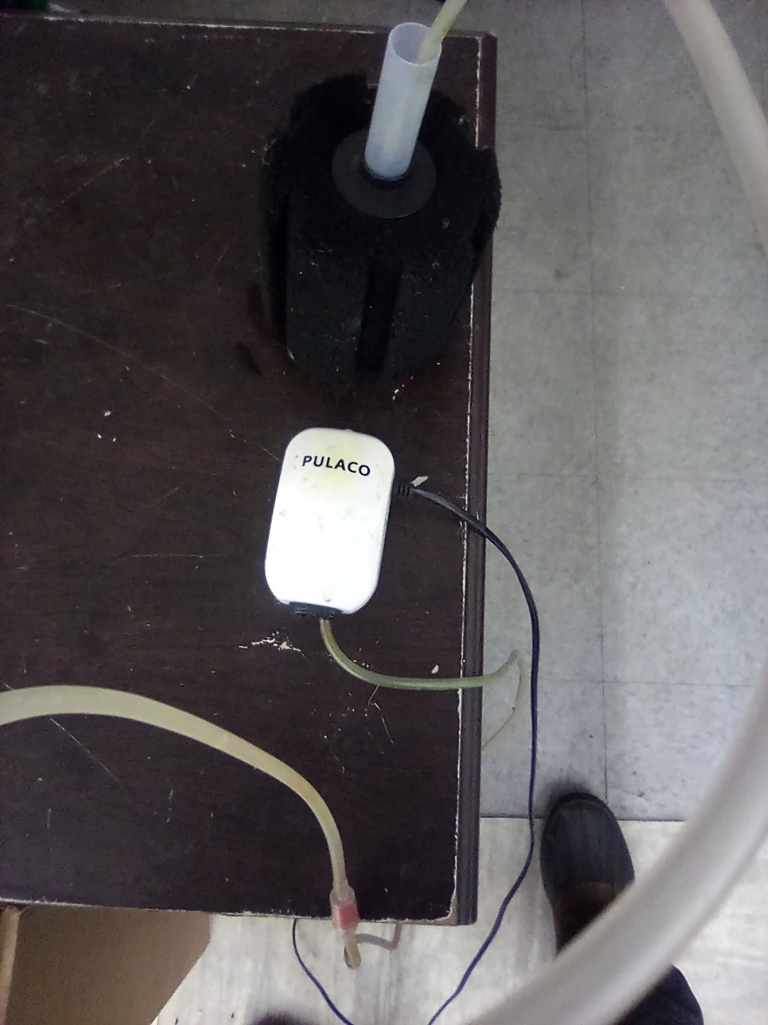 This is a PULACO brand aquarium air pump and sponge filter set. It's designed for aquarium use. The set includes the air pump, a sponge filter, and tubing.
