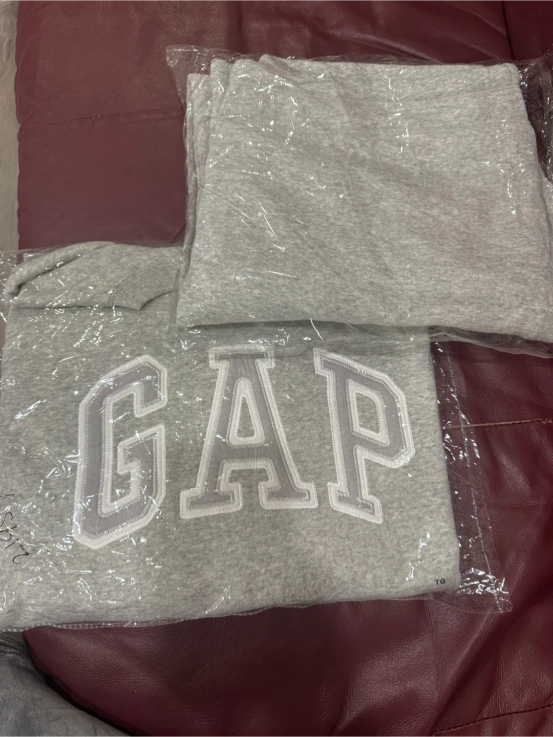 This is a GAP women's crewneck sweatsuit in grey. It features the classic GAP logo across the chest. Made from a soft, comfortable fabric. Perfect for casual wear.
