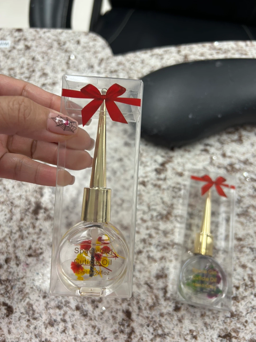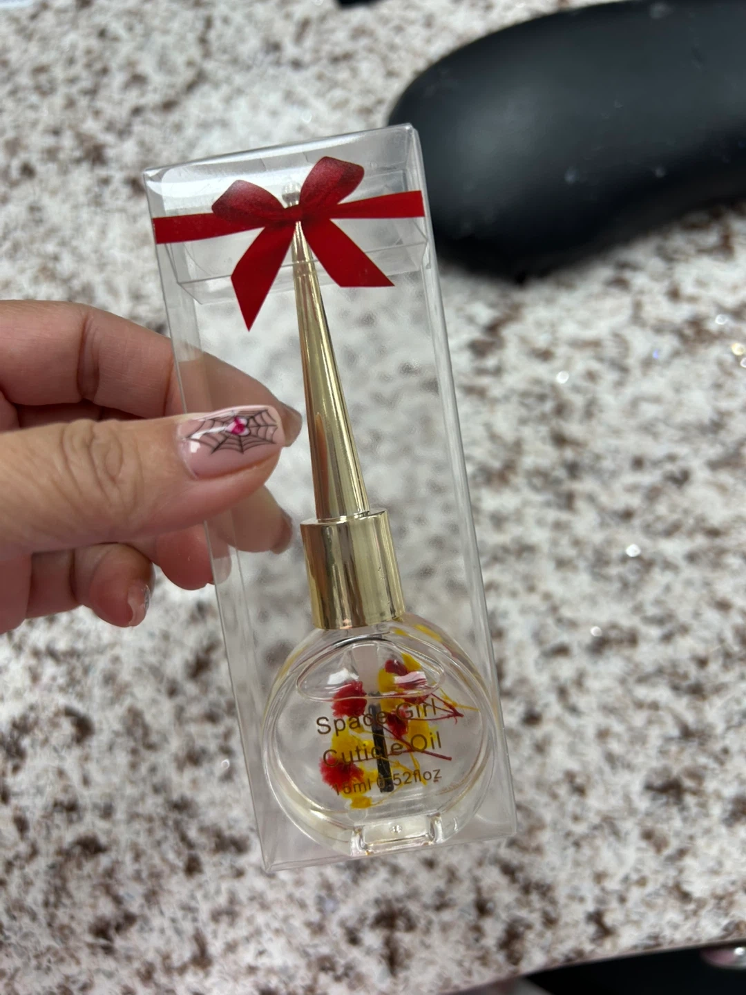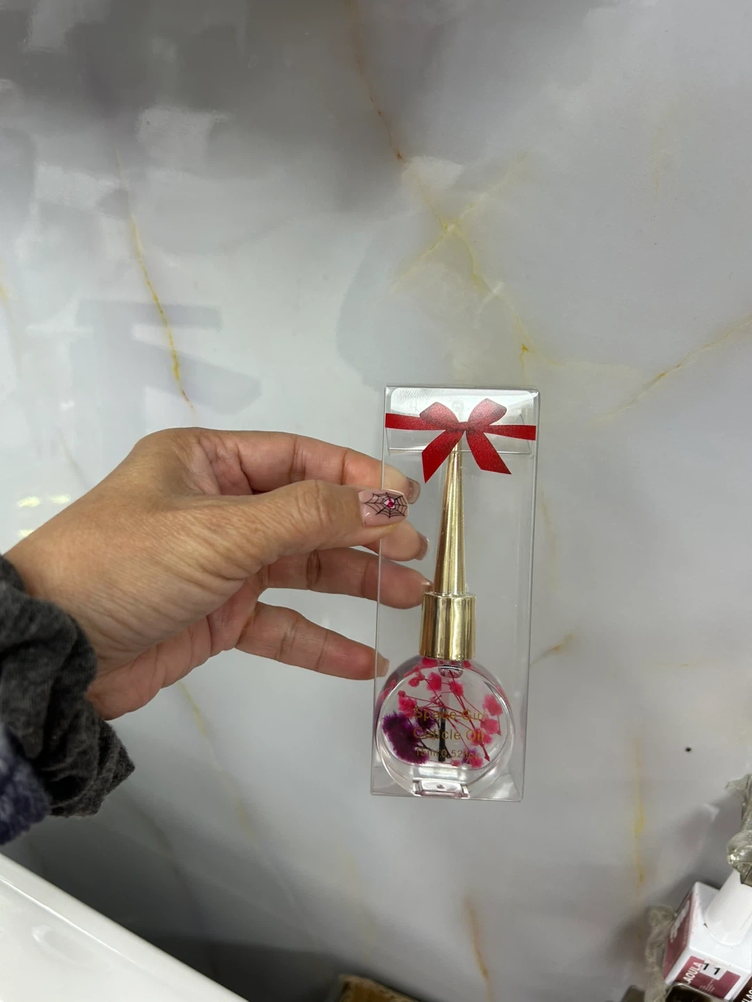 This cuticle oil comes in a cute bottle with a gold applicator. It's 15ml and has dried flowers inside. The bottle is packaged in a clear box with a red ribbon.