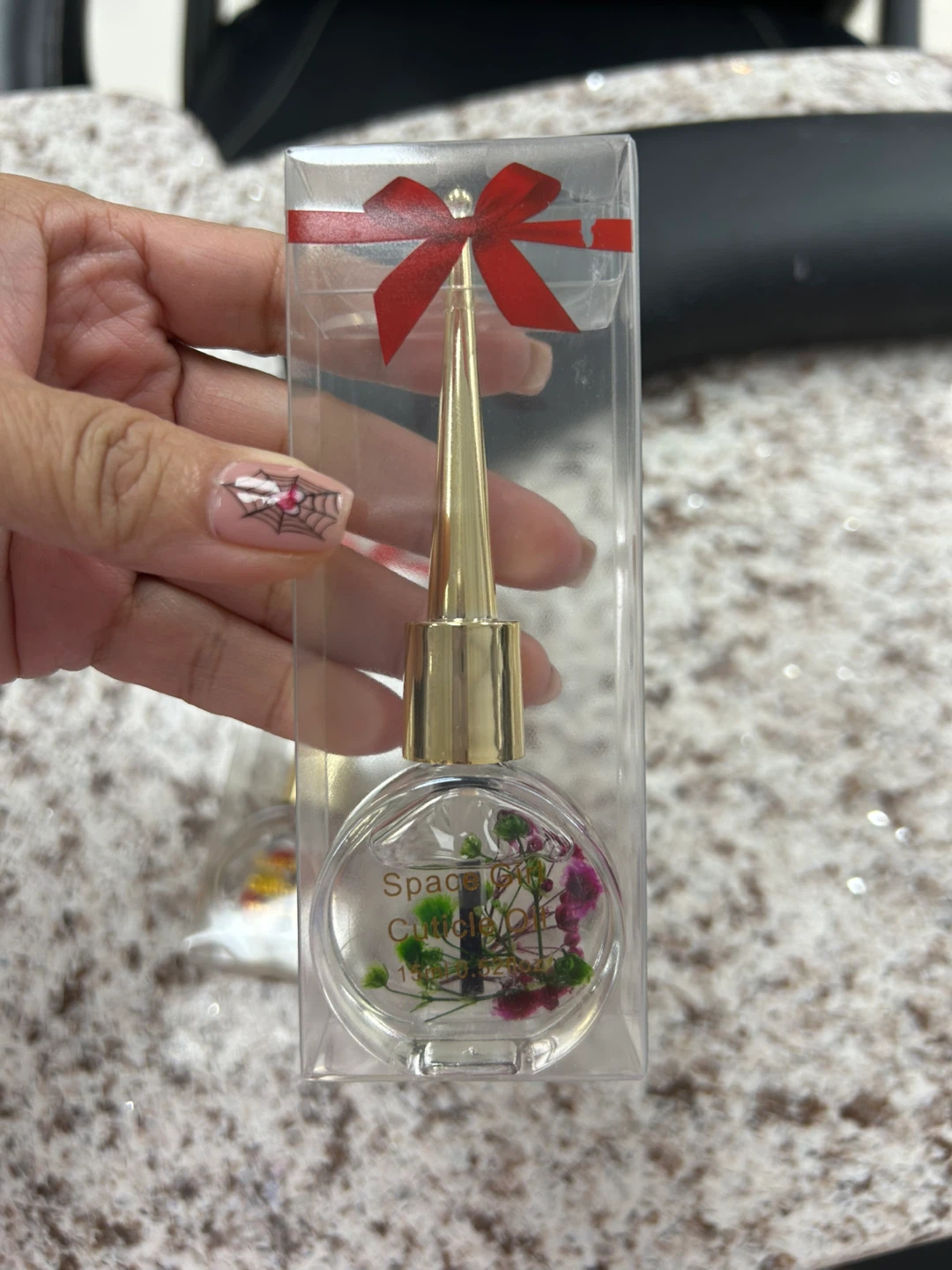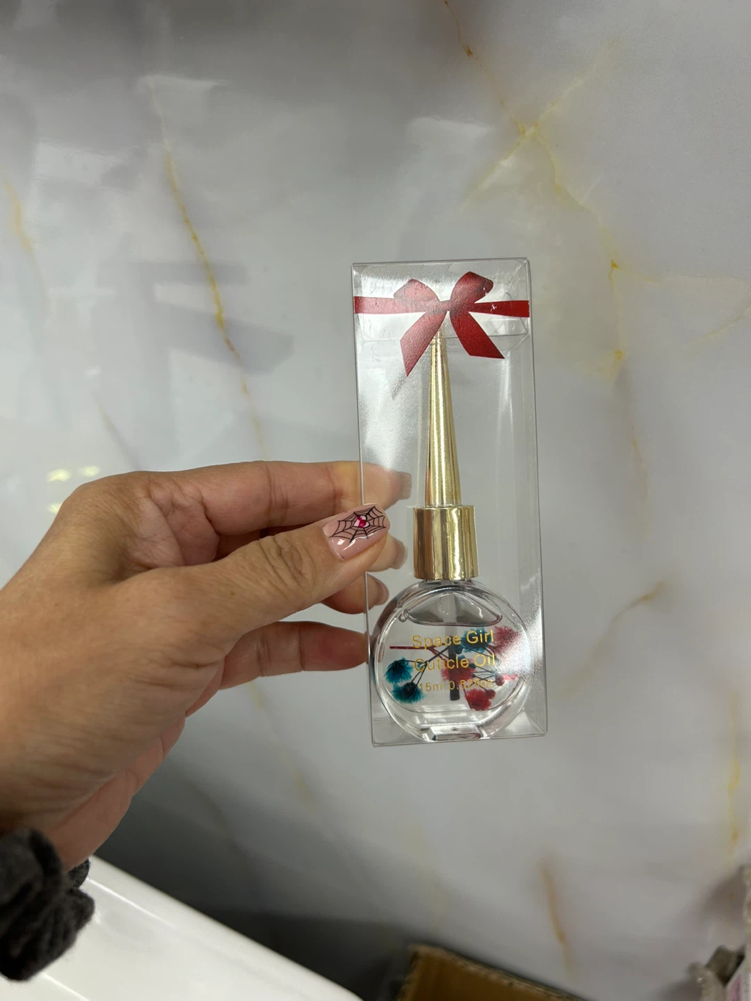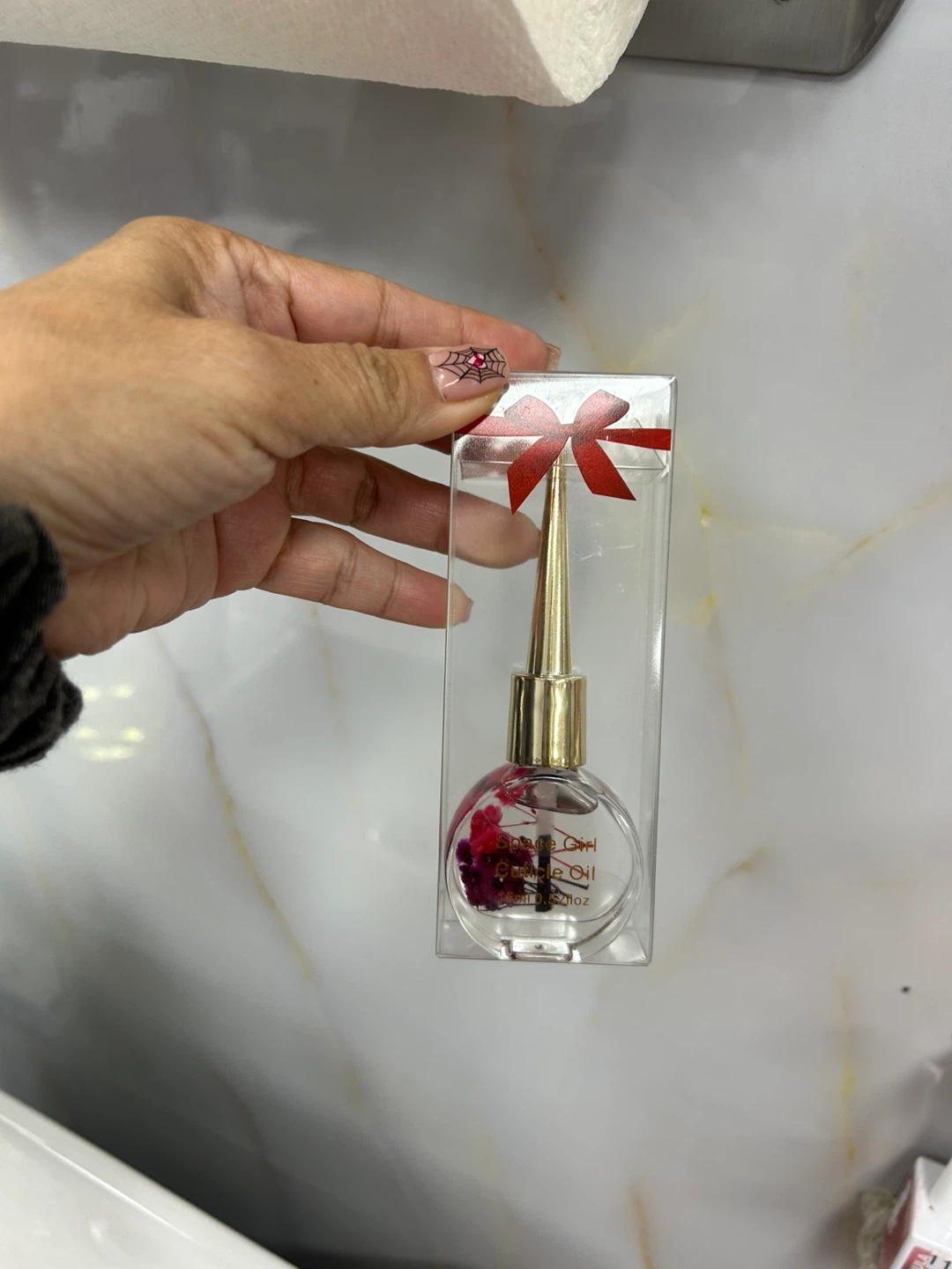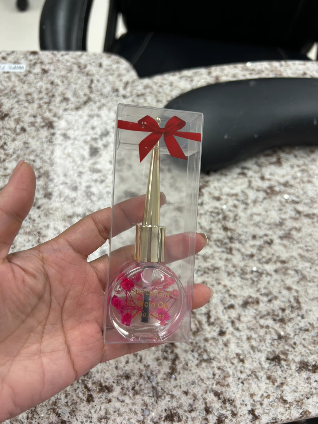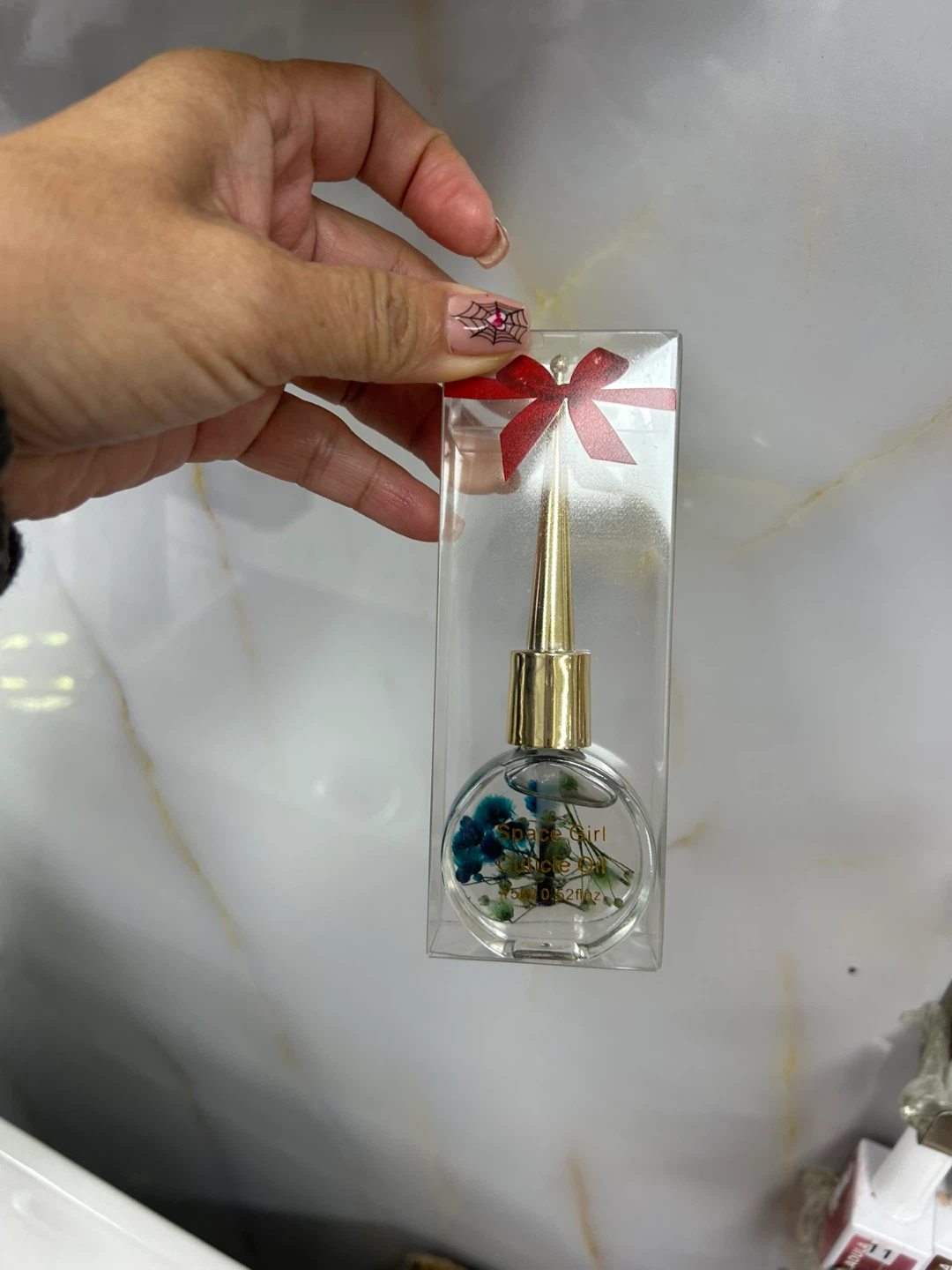 This cuticle oil comes in a cute bottle with a gold applicator. It's 15ml and has dried flowers inside. The bottle is packaged in a clear box with a red ribbon.