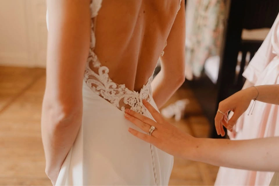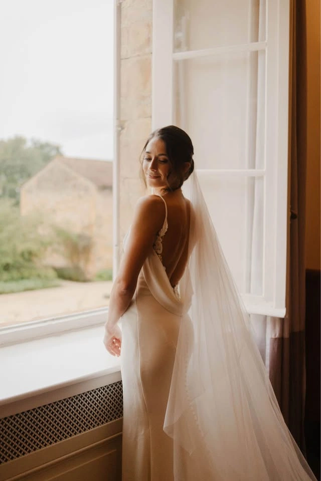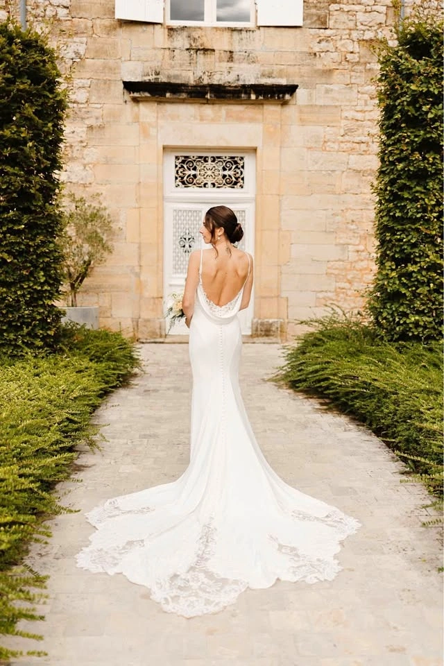 73Selling my beautiful wedding dress!! It’s Enzoani Alanis, approx size 2. I absolutely adored my dress and felt so comfortable in it all day & night. It’s a lovely crepe material with double lining. Backless, with lace detail, and a removable cowl back scoop. The train is gorgeous with lace detailing. It has a wrist loop to carry as well as a bustle sewn in (bustles like a dream! See pics). I had the dress altered slightly smaller in the hips. I had the V-neck front altered to make the V deeper and more dramatic. It’s been professionally dry cleaned following the wedding. Please let me know if you’d like more pictures or if any questions!