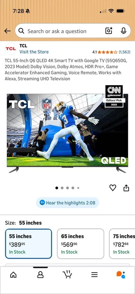 Upgrade your home theater with this 2023 TCL 55-inch Q6 Series smart TV. This unit features Quantum Dot (QLED) technology, delivering over a billion colors for a richer, more lifelike picture compared to standard LED TVs. Perfect for both movie buffs and gamers, it supports premium formats like Dolby Vision, HDR10+, and Dolby Atmos for a cinematic experience. Gamers will appreciate the Motion Rate 240 (with MEMC frame insertion) for smooth, fluid action during high-speed gameplay. Key Specifications: Model: 55Q650G (2023 Series), Display: 4K UHD QLED with 500 Nit peak brightness, Smart Platform: Google TV (built-in Chromecast and Voice Control), Audio: Integrated Dolby Atmos surround sound, Connectivity: 3 HDMI ports, Wi-Fi, and Bluetooth. The TV is in excellent working condition, currently running the Google TV interface smoothly.