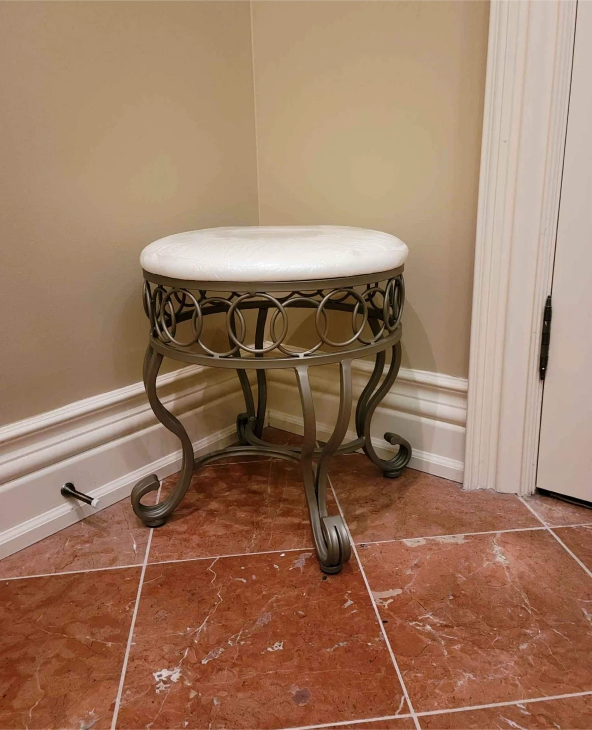 Round vintage white upholstered vanity stool in mint condition. Features carved metal legs. Can be used as a foot stool or an ottoman as well.