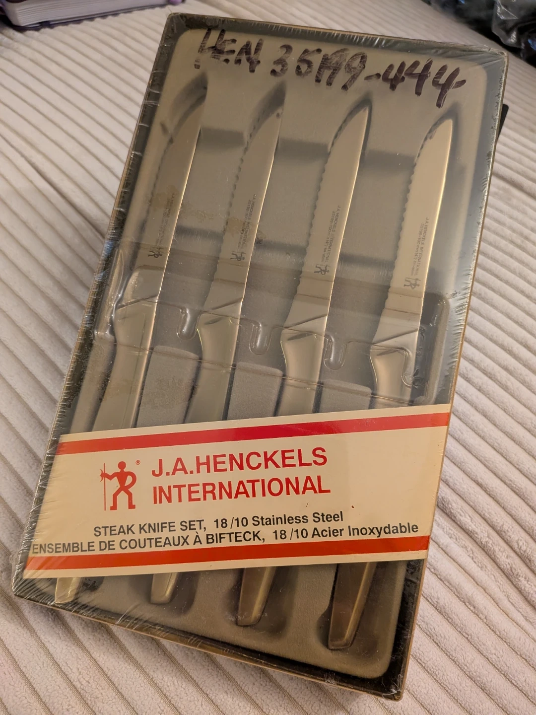 Set of J.A. Henckels International steak knives. Made from 18/10 stainless steel. Includes original packaging.