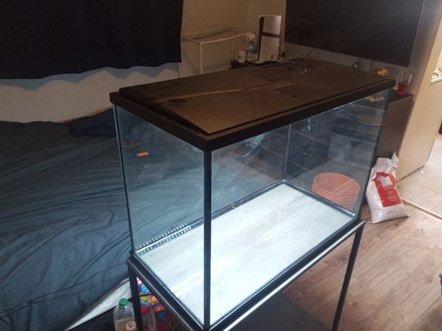 Large aquarium tank complete with two detailed pirate ship decorations. It's perfect for creating an underwater scene! Comes with a lid and built-in lighting. NO LEAKS Can deliver for full price.
