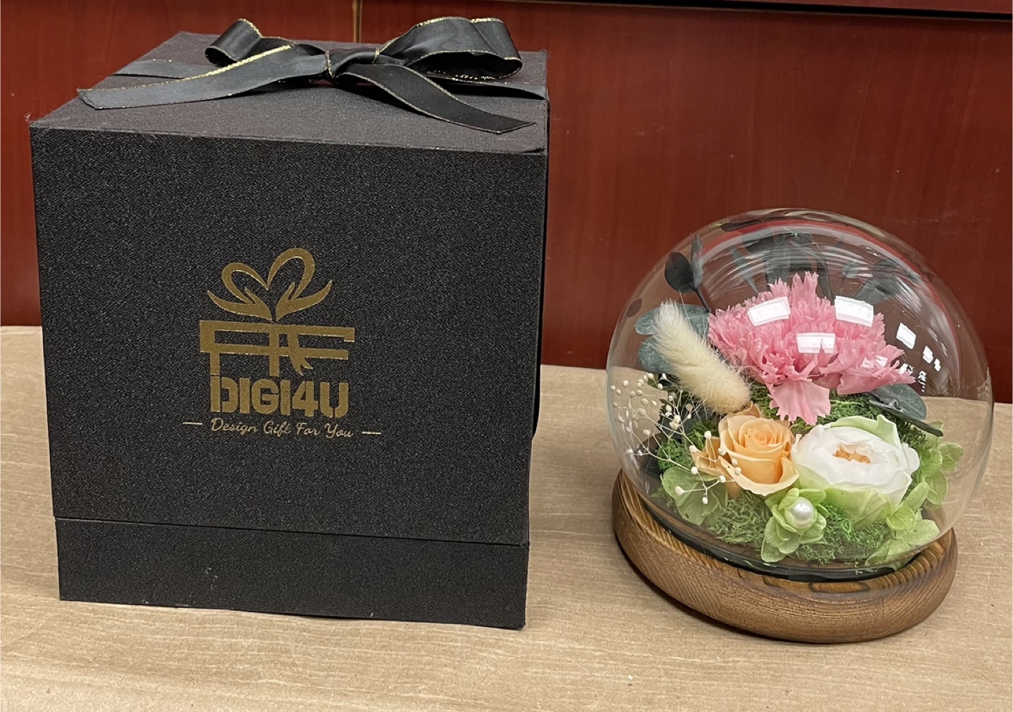 This DIGI4U preserved flower dome features pink, peach, and white flowers under a glass cloche. It comes with a black gift box, ready for gifting. Perfect for adding a touch of elegance to any room!