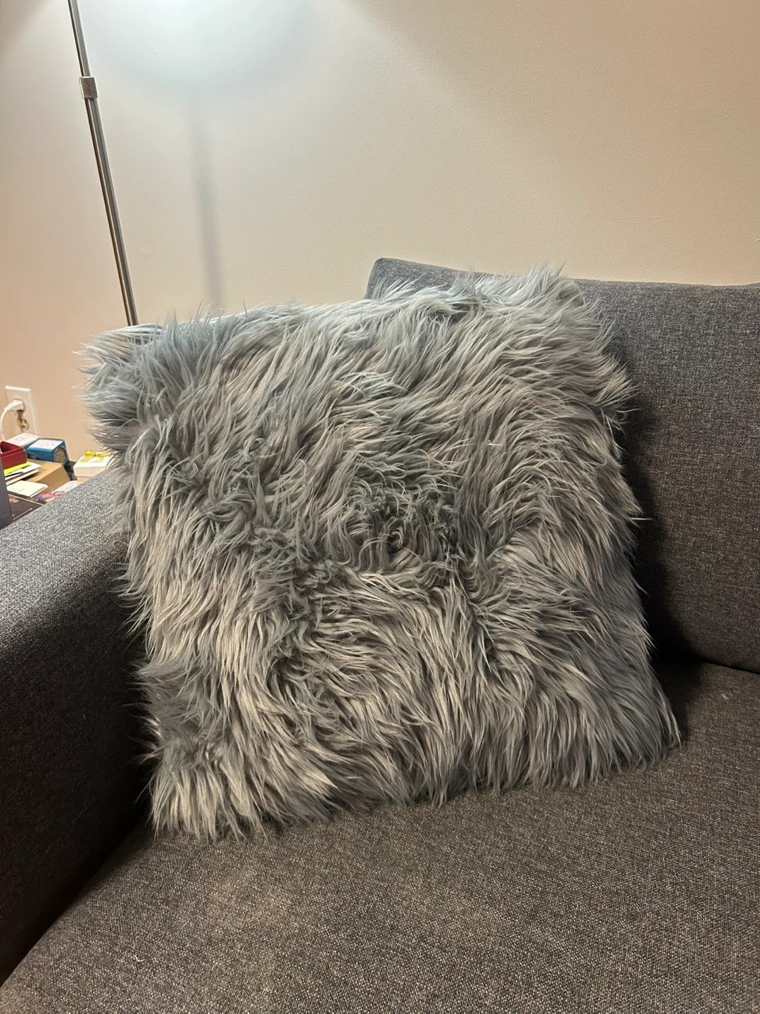 Selling a barely used super soft grey faux fur throw pillow! It's in perfect, new condition and would add a cozy touch to any couch or bed.