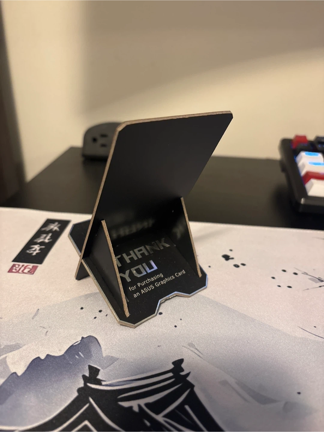 This is a black cardboard stand that says "Thank You for Purchasing an ASUS Graphics Card". It's designed to hold a phone. Made from durable cardboard material.