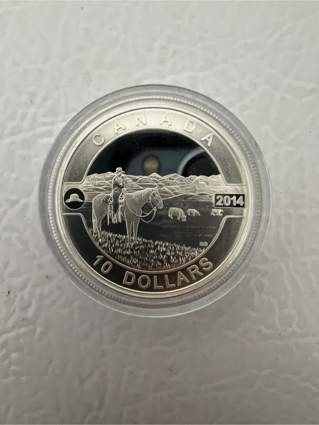 .9999 half ounce Silver coin. This is a 2014 $10 fine silver coin from the Royal Canadian Mint. It features "The Canadian Cowboy" design. It comes in its original box with a certificate. A great collectible coin!