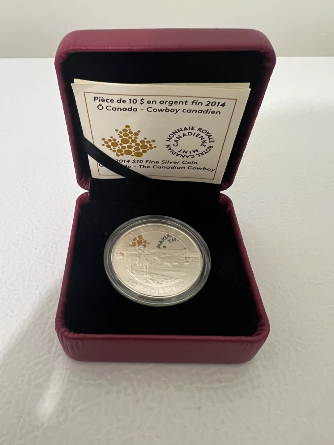 .9999 half ounce Silver coin. This is a 2014 $10 fine silver coin from the Royal Canadian Mint. It features "The Canadian Cowboy" design. It comes in its original box with a certificate. A great collectible coin!