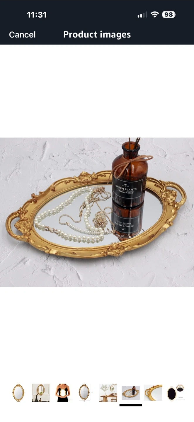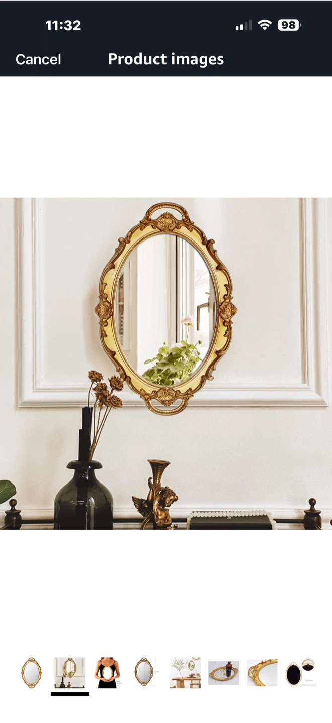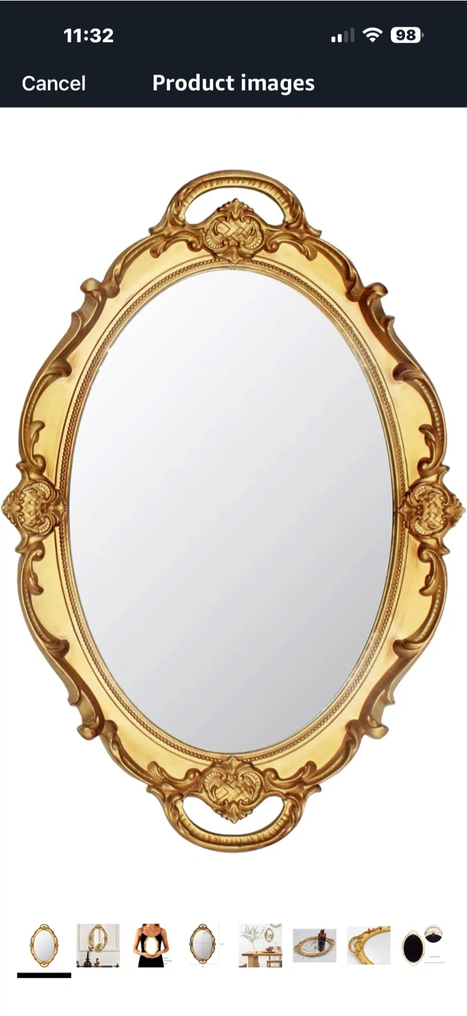 This vintage-inspired oval mirror features an ornate, gold-toned frame with decorative scrollwork. It's perfect for adding a touch of elegance to your vanity or dresser. The mirror itself is clear and reflective.