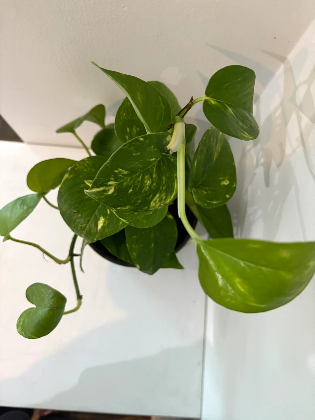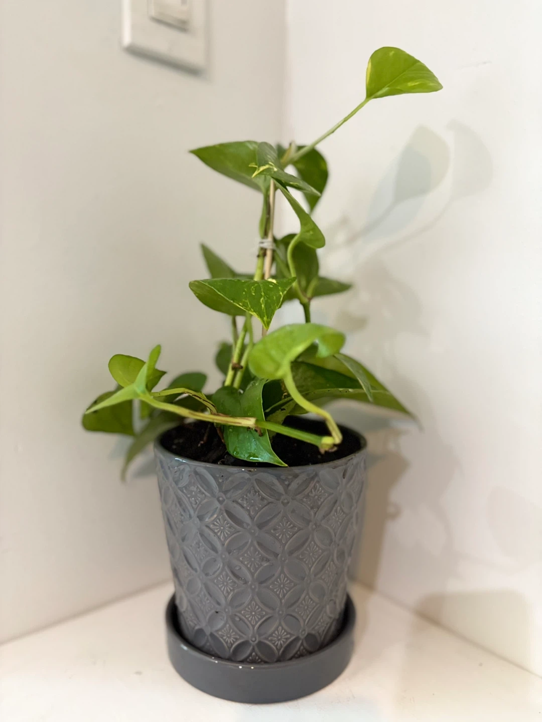 A lovely Pothos plant housed in a stylish grey patterned pot with a matching saucer. It's a classic houseplant known for its vining leaves. Easy to care for, it adds a touch of green to any space!