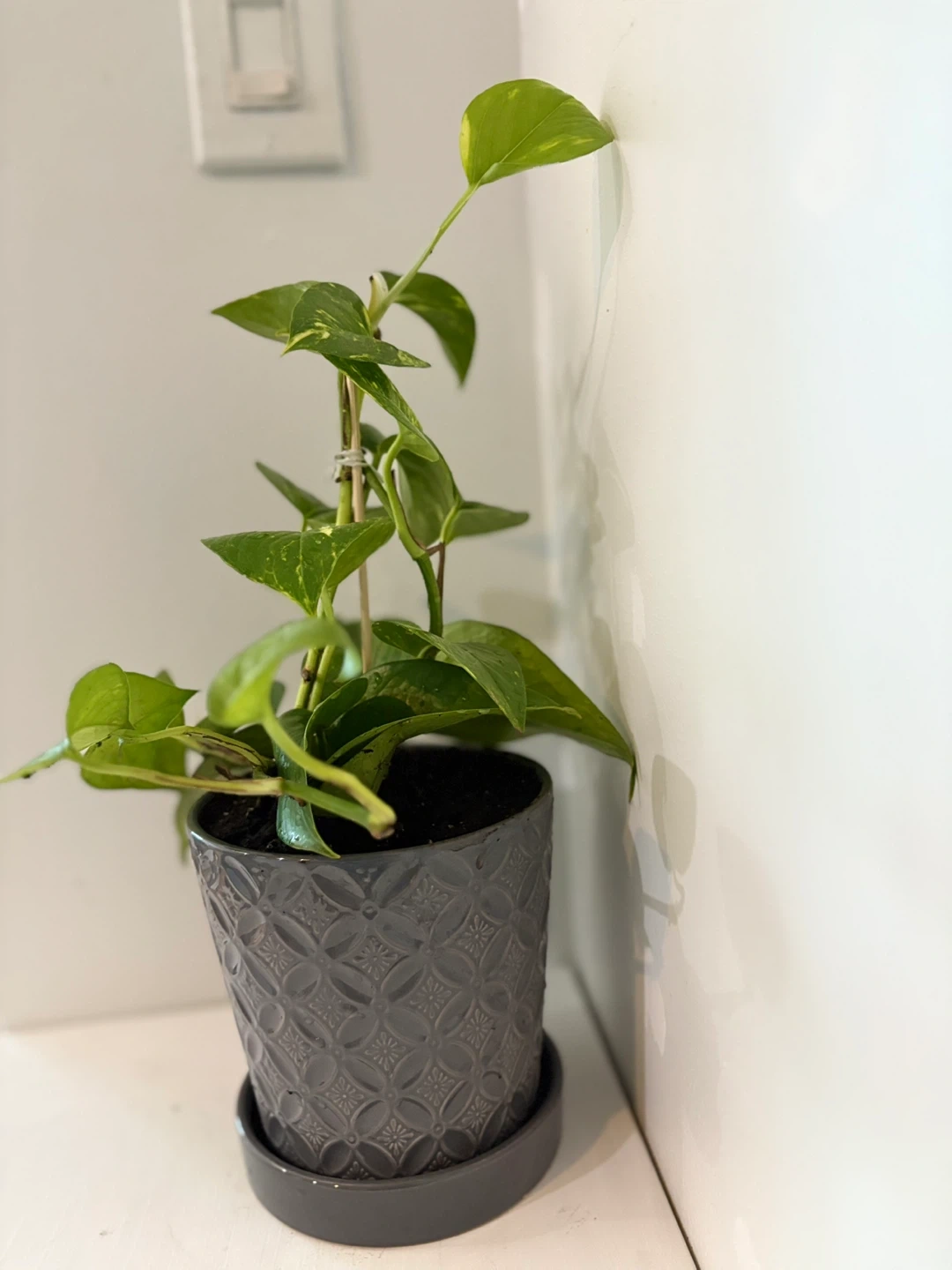 A lovely Pothos plant housed in a stylish grey patterned pot with a matching saucer. It's a classic houseplant known for its vining leaves. Easy to care for, it adds a touch of green to any space!