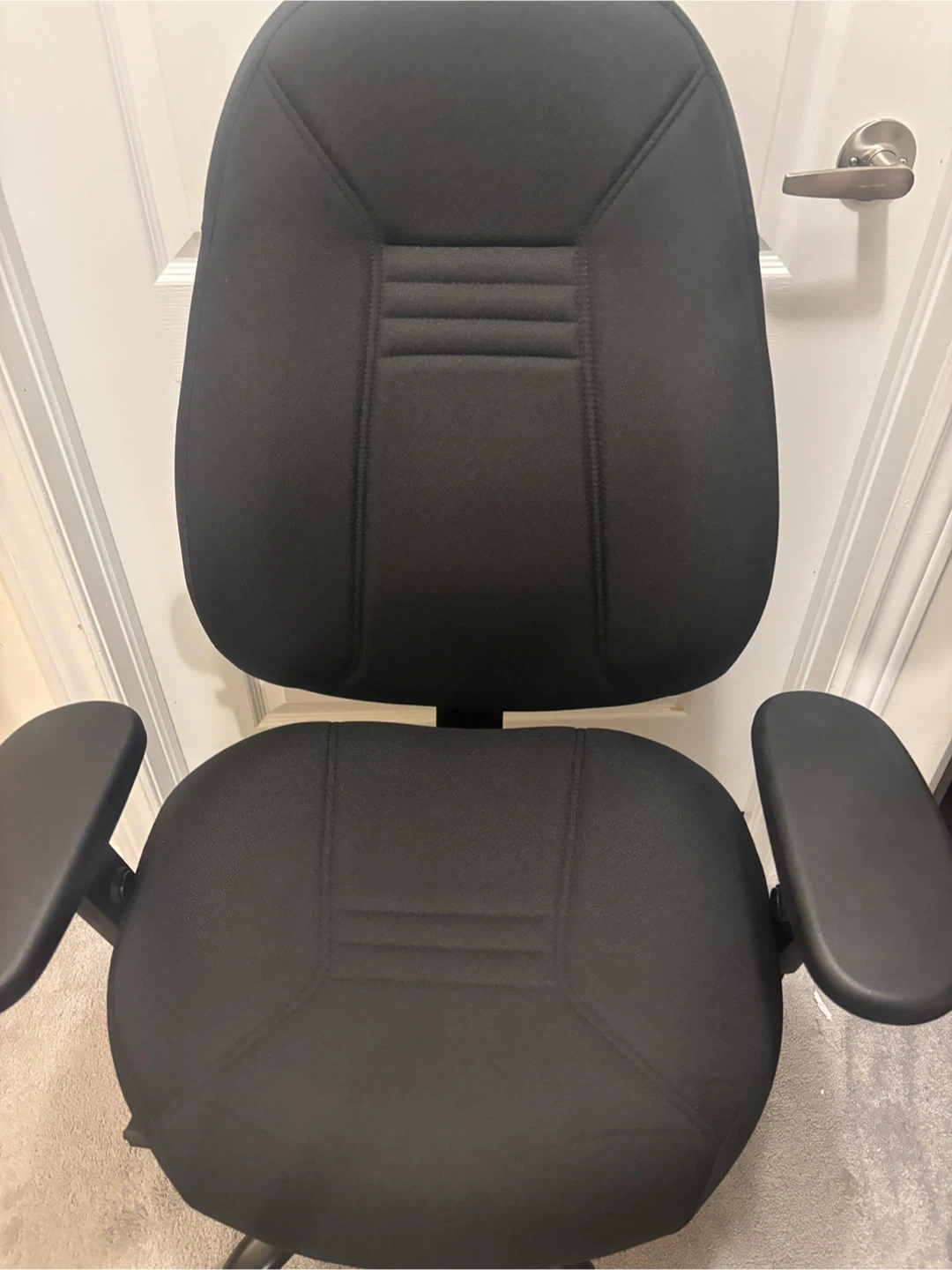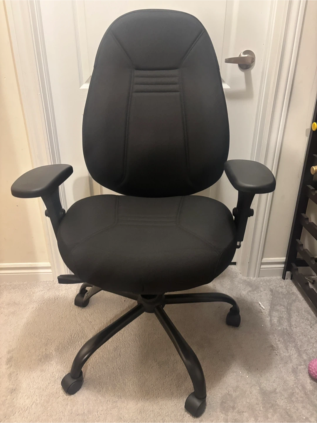 A comfortable black office chair with adjustable armrests and a sturdy base. It's upholstered in fabric and features a padded seat and backrest. Great for your home office setup! Available for