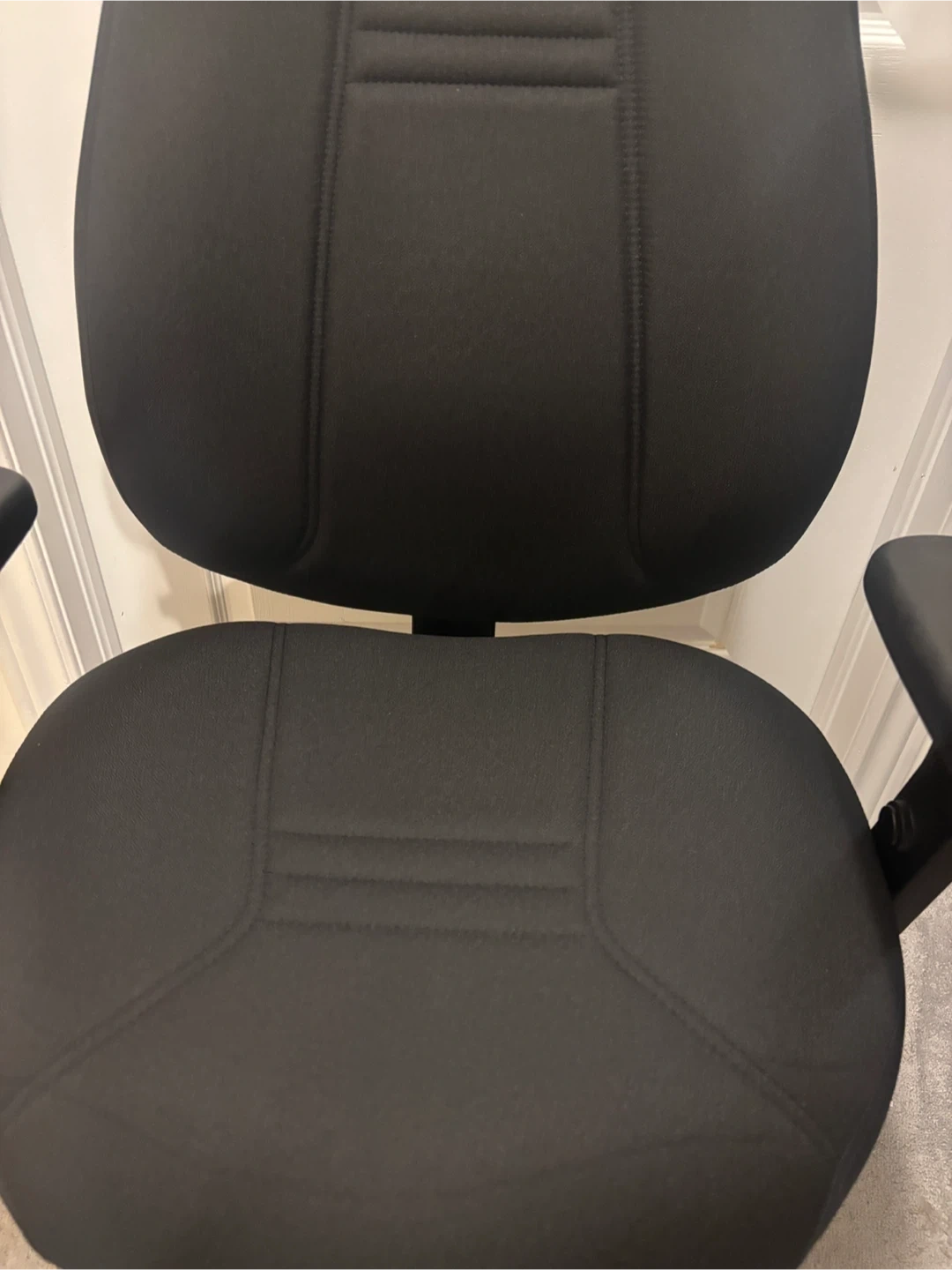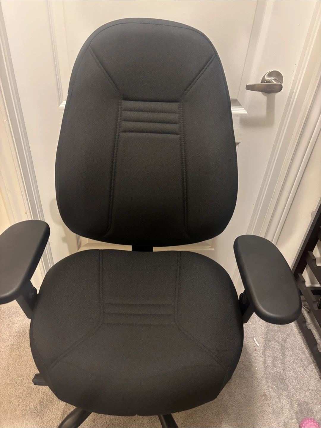 A comfortable black office chair with adjustable armrests and a sturdy base. It's upholstered in fabric and features a padded seat and backrest. Great for your home office setup! Available for