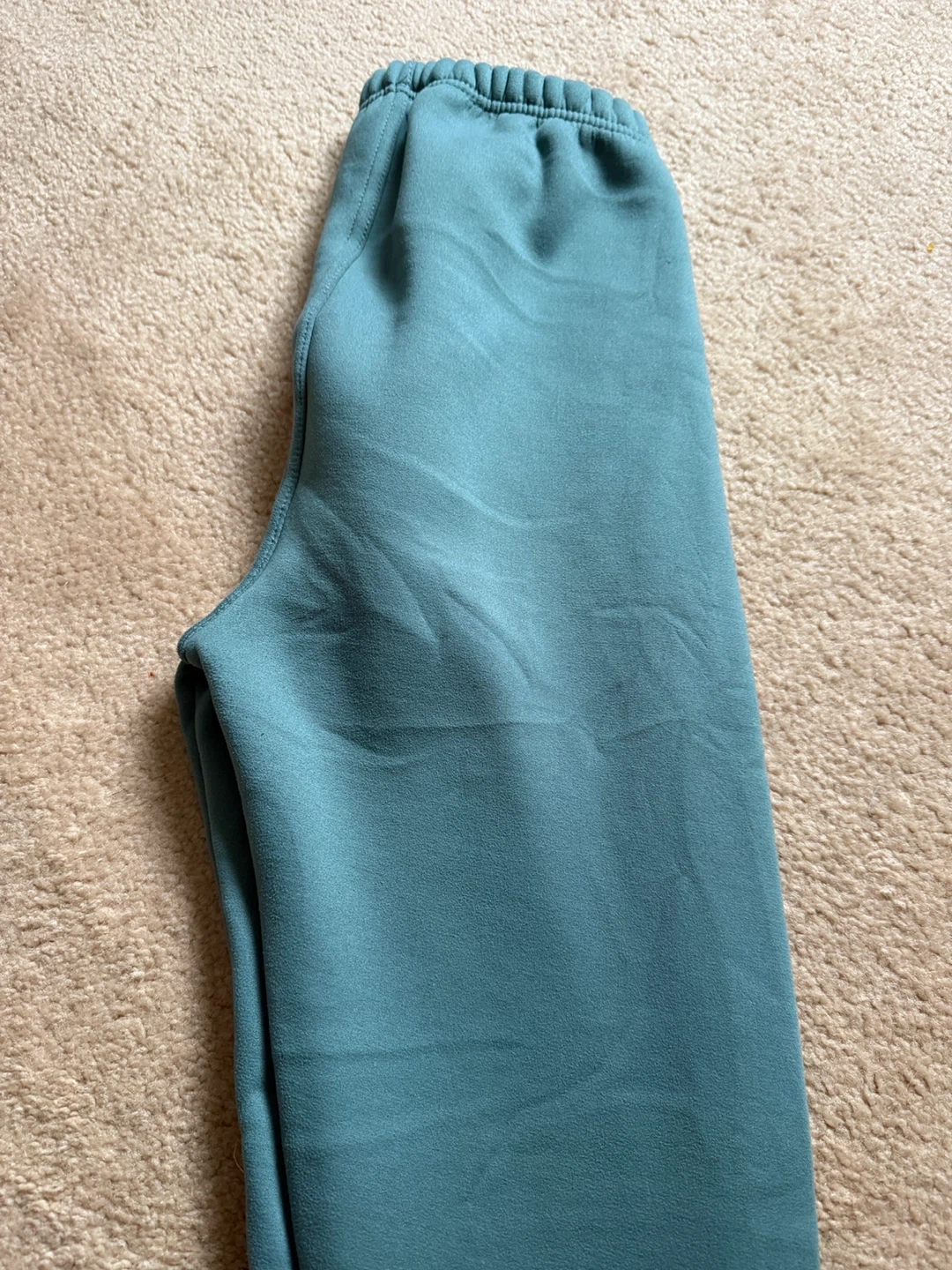 Cozy fleece-lined sweatpants in a teal colour. Made with 93% polyester and 7% spandex. Wash with like colours.