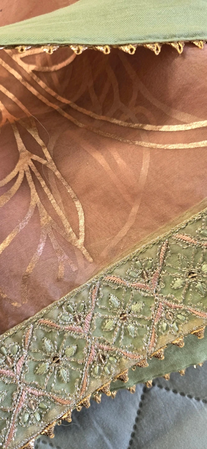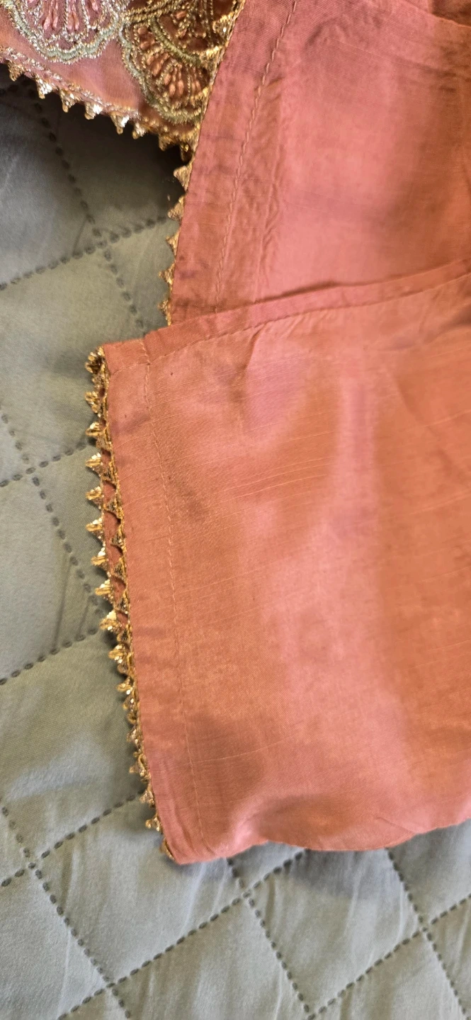 Beautifully detailed pink dress featuring intricate embroidery and small mirror accents. It's made with a combination of sheer organza overlay and a solid lining. The sleeves and neckline are adorned with delicate silver and green threadwork and sequin details. Perfect for festive occasions or formal wear!