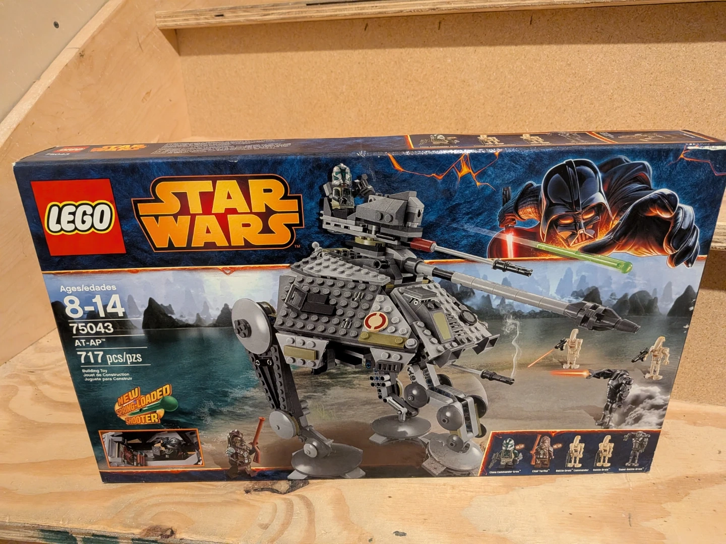 This is the LEGO Star Wars AT-AP set, number 75043. It contains 717 pieces and features a spring-loaded shooter. It's recommended for ages 8-14. It is brand new, unopened. This item has been discontinued.