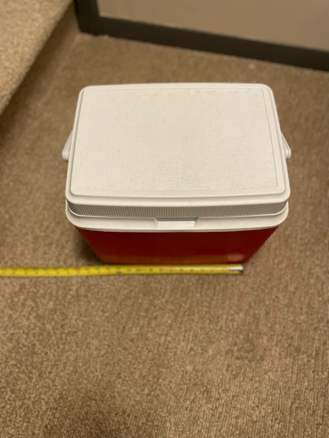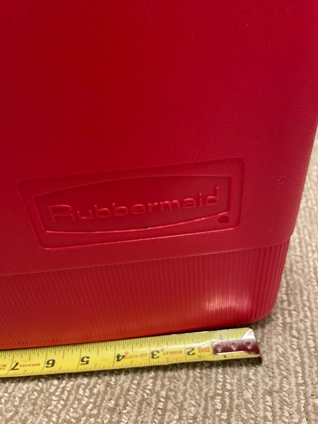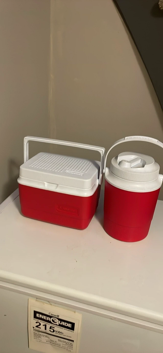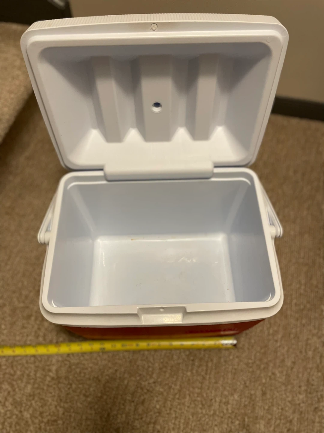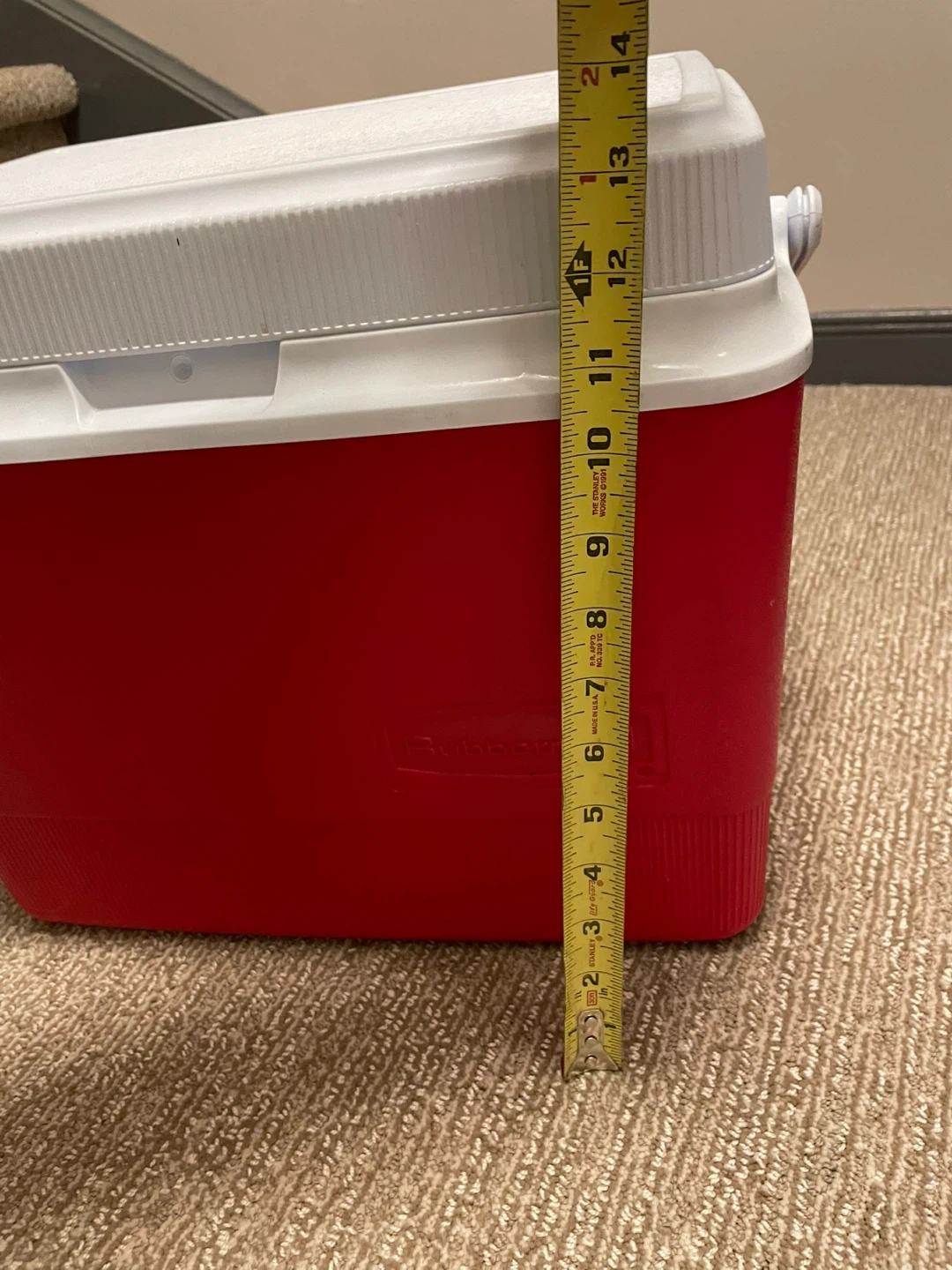 A red Rubbermaid cooler with a white lid. It's approximately 13 inches tall and 15 inches long (24 qt). Perfect for picnics or camping trips! It comes with a matching personal cooler (5 qt) and thermos jug (1/2 gal).