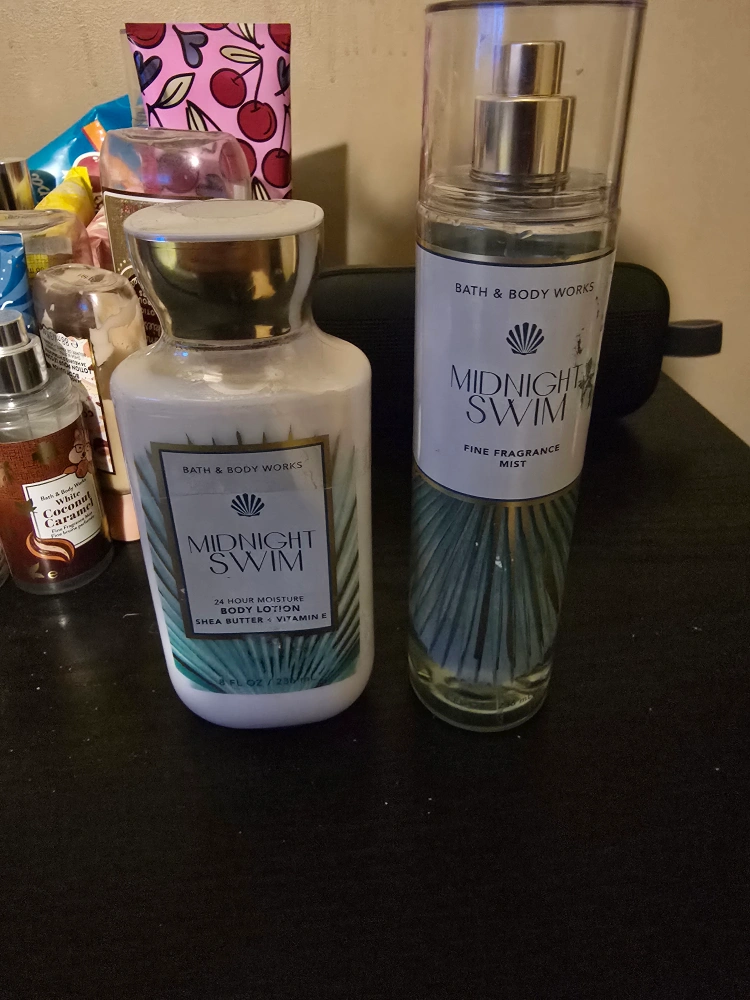 Bath & Body Works Midnight Swim collection. Includes body lotion and fine fragrance mist. 24 hour moisture body lotion. Some label damage on mist bottle. the mist has been used.