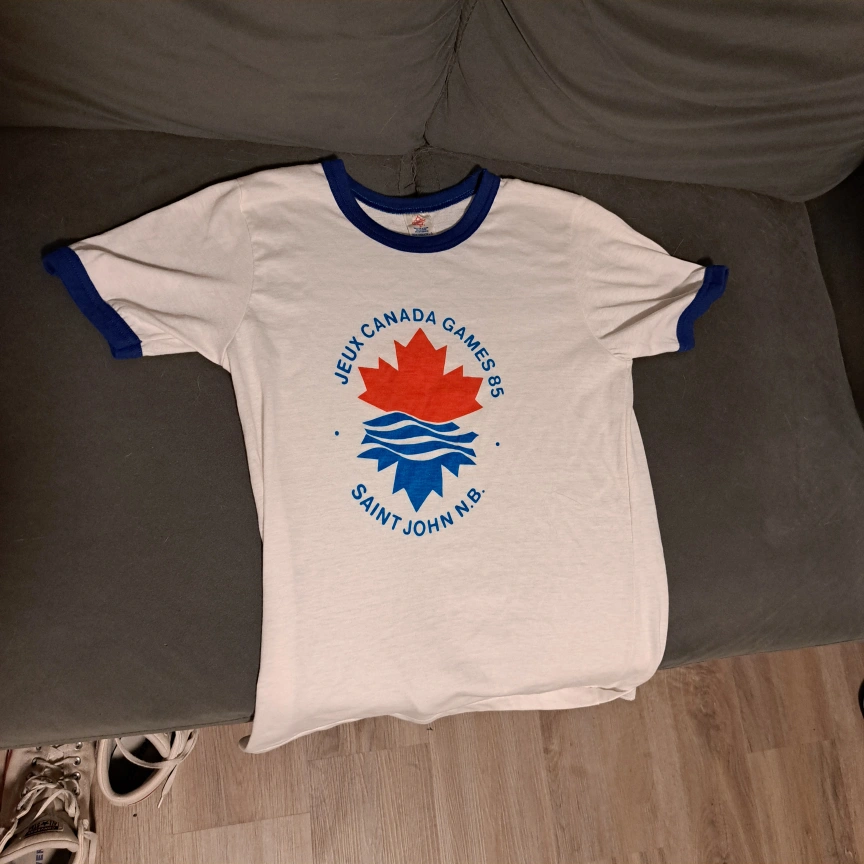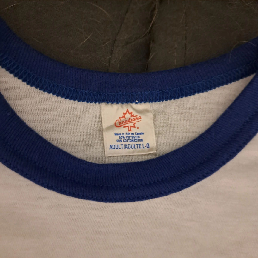 Selling a Canadiana ringer t-shirt featuring the Jeux Canada Games 85 logo. It's a size L and made from 50% polyester and 50% cotton. The shirt has a classic ringer style with blue trim on the neck and sleeves.