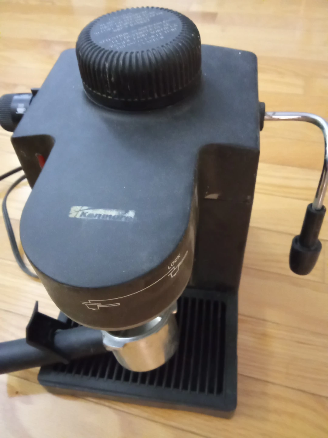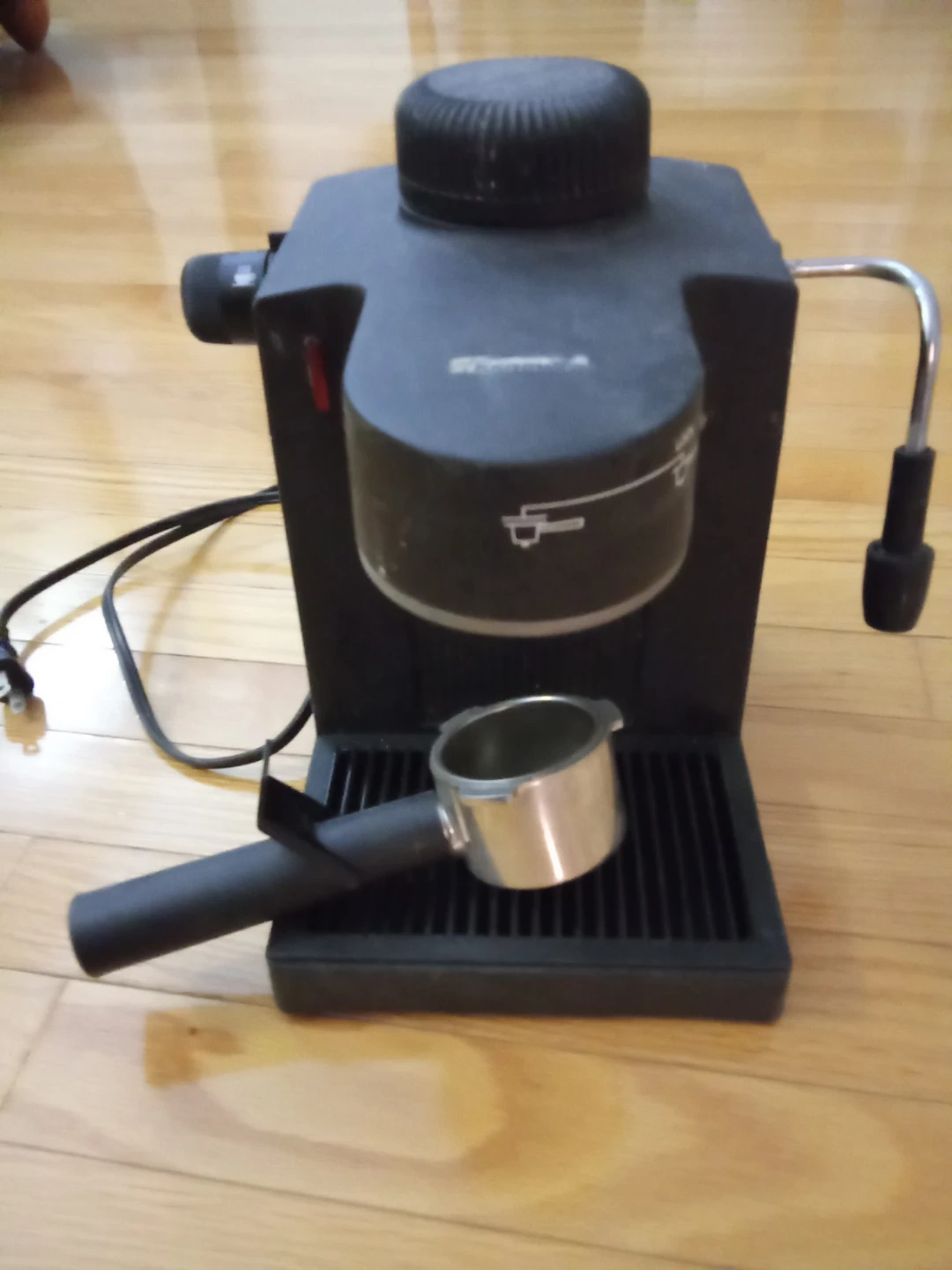 This is a Kenmore espresso machine for making your favourite coffee drinks at home. It includes a portafilter for brewing. It has a steam wand for frothing milk.