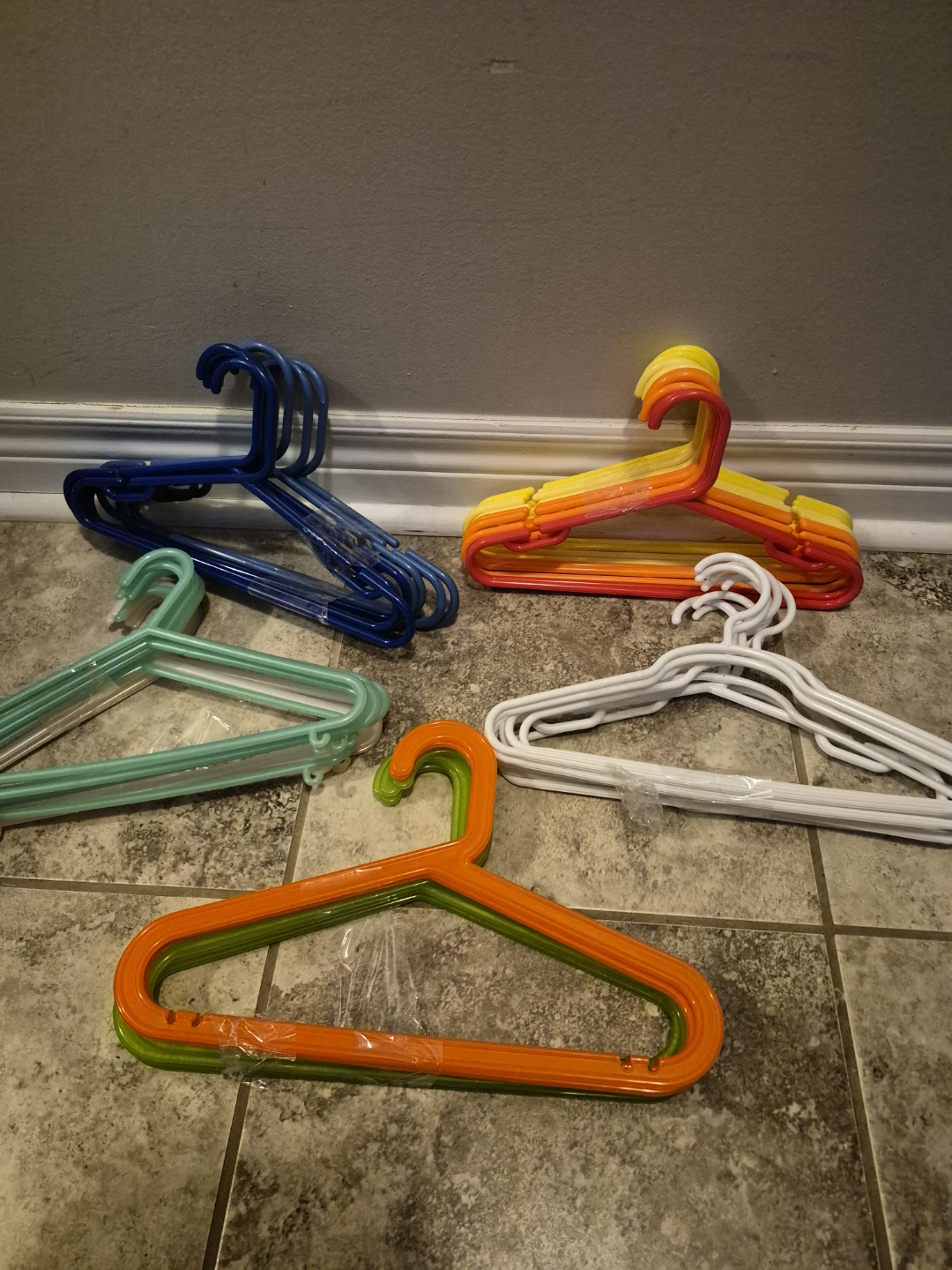 Selling a set of children clothes hangers in assorted colours.