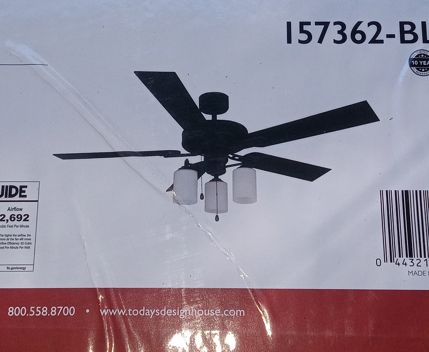 Design House Aubrey 52 inch LED ceiling fan. Matte black finish with frosted white glass shades. Includes 3-speed pull chain control. 5 reversible blades and 3 light fixtures.
