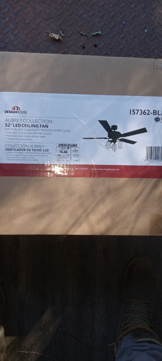 Design House Aubrey 52 inch LED ceiling fan. Matte black finish with frosted white glass shades. Includes 3-speed pull chain control. 5 reversible blades and 3 light fixtures.
