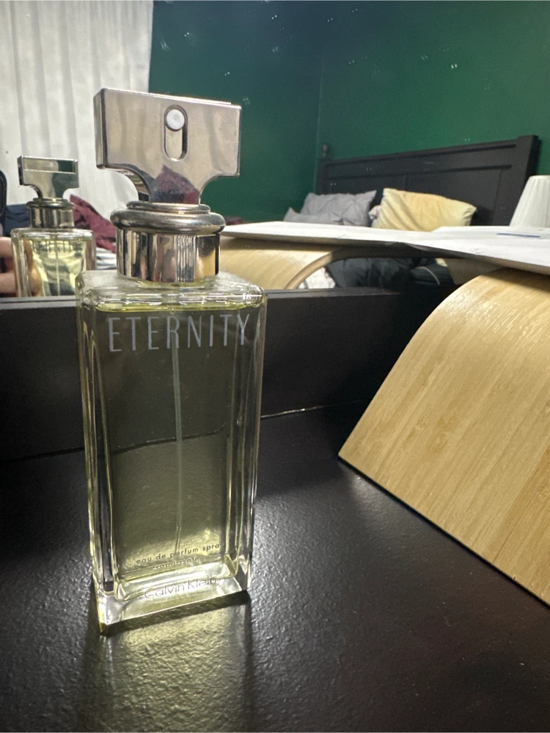 This is a bottle of Calvin Klein Eternity Eau de Parfum spray for women. It's a classic fragrance with a refreshing scent. The bottle is made of clear glass and has a silver cap.