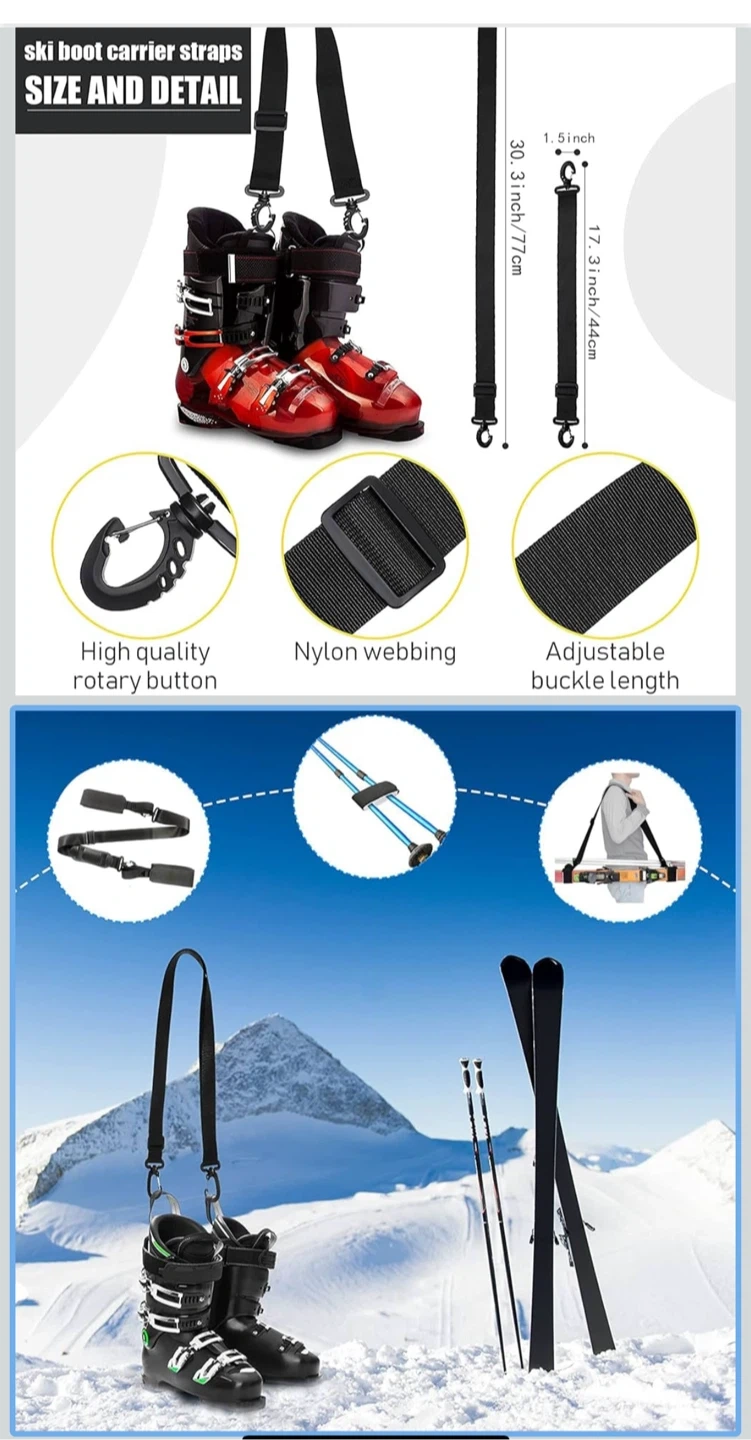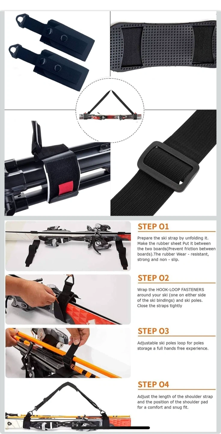 This set includes straps for carrying skis, poles, and ski boots. It features adjustable straps, a padded shoulder strap for comfort, and durable nylon webbing. The hook-and-loop fasteners ensure a secure grip on your gear, freeing up your hands for easier transport to the slopes! It's designed for convenience when travelling with winter sports equipment.