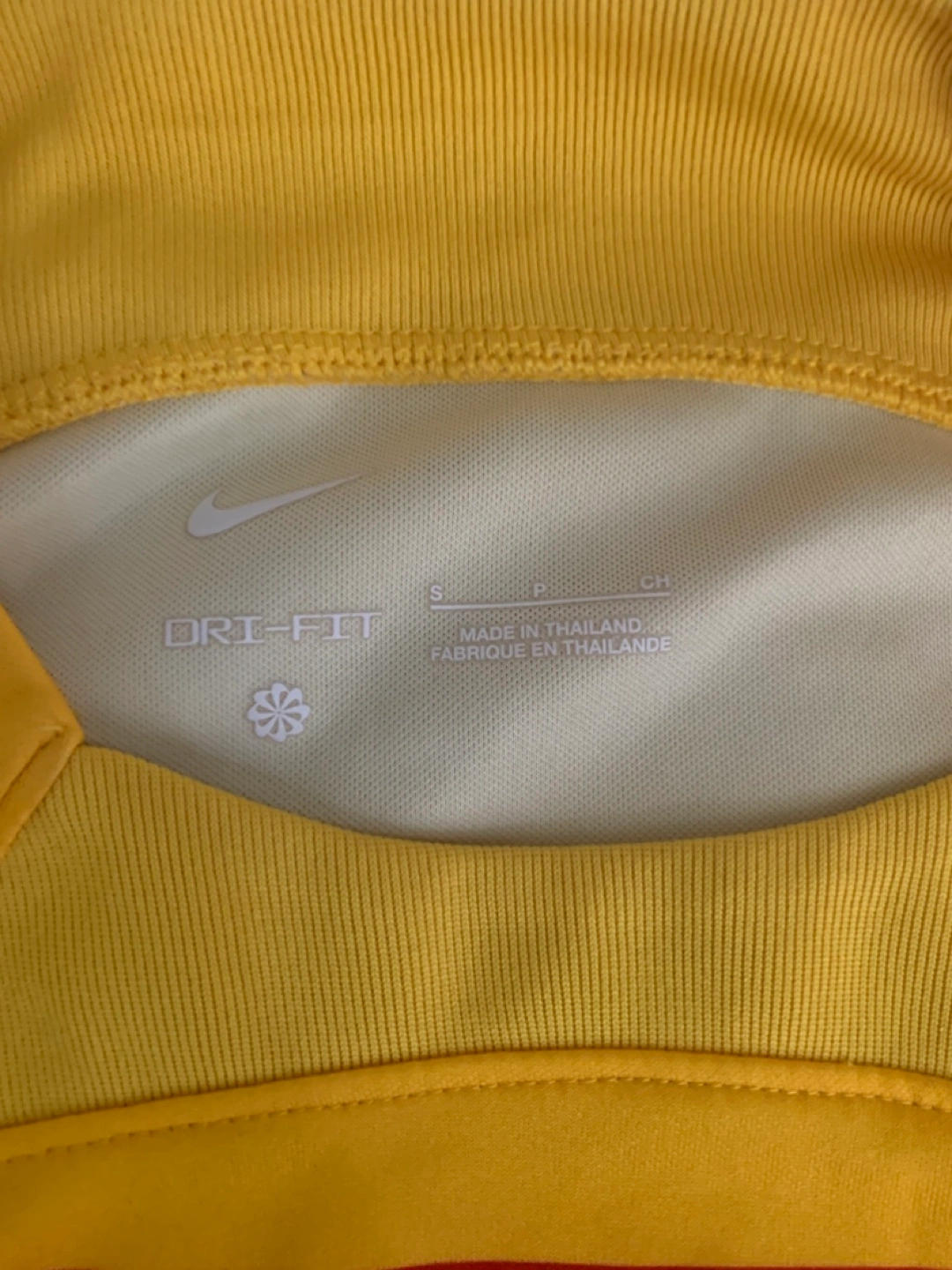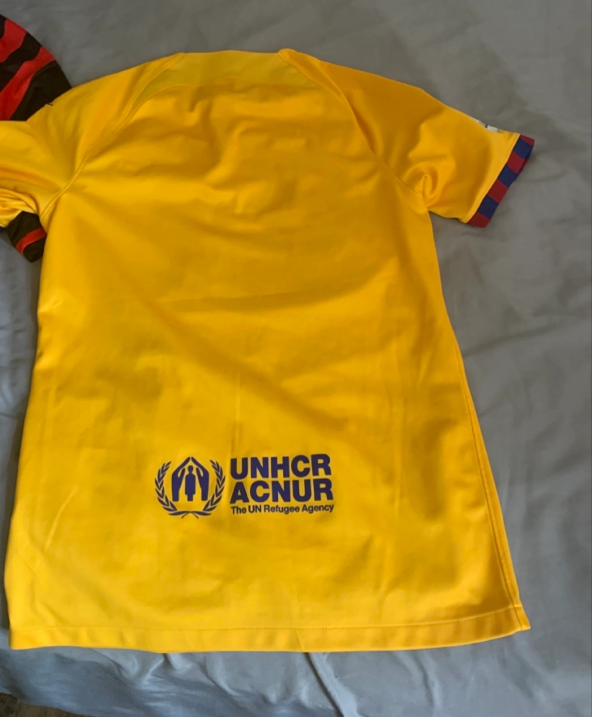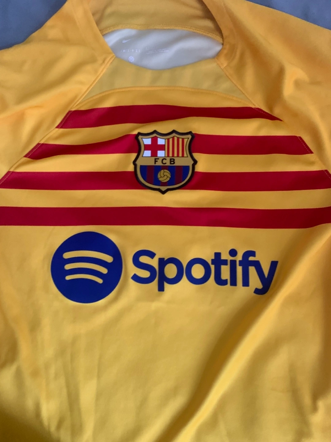 FC Barcelona away jersey. Yellow with red and maroon stripes. Spotify sponsor logo. UNHCR logo on the back. Nike Dri-FIT technology. Size small.
